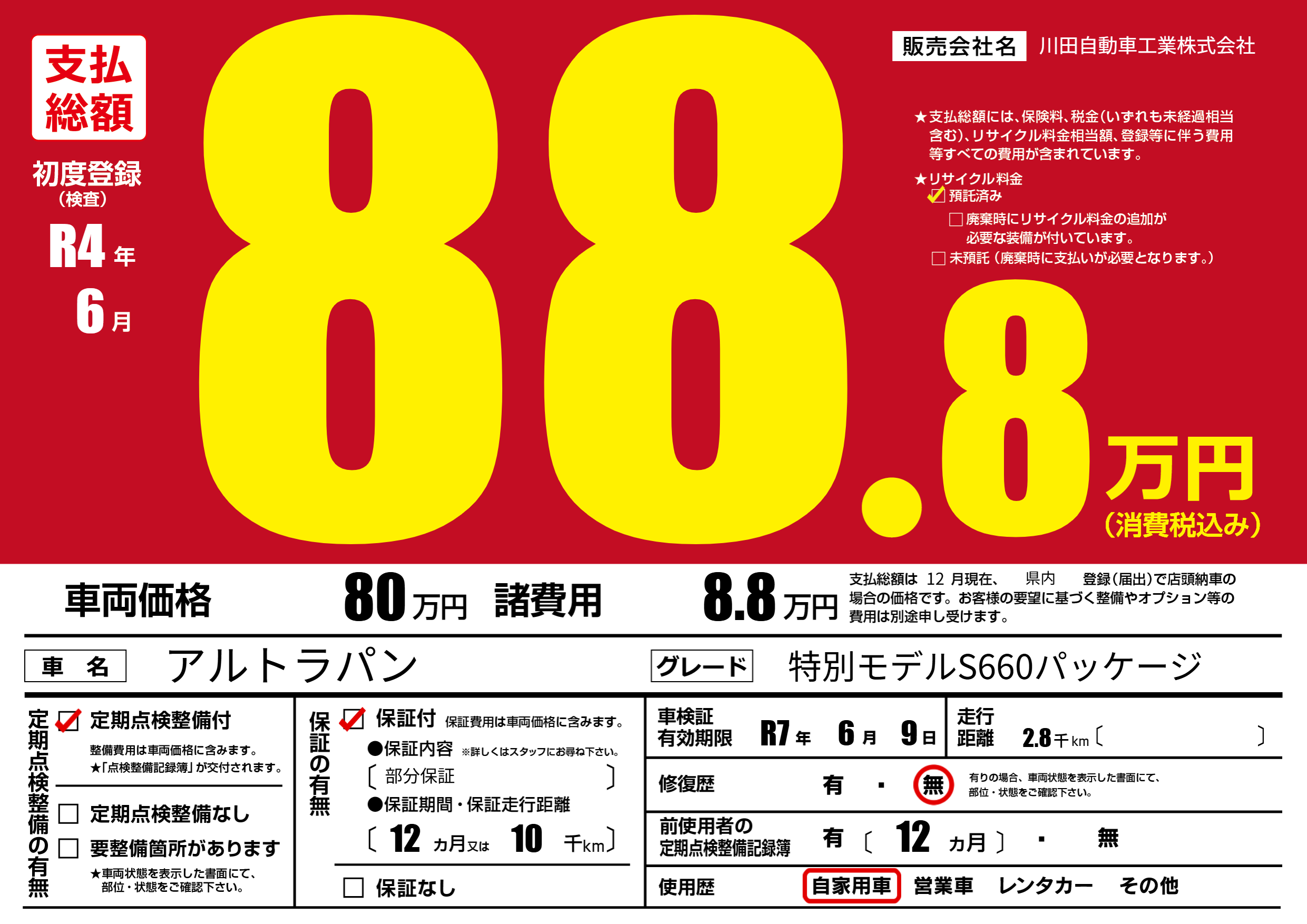 | 走行キロ | 0.2万km | 初年度登録 | R4年6月 |