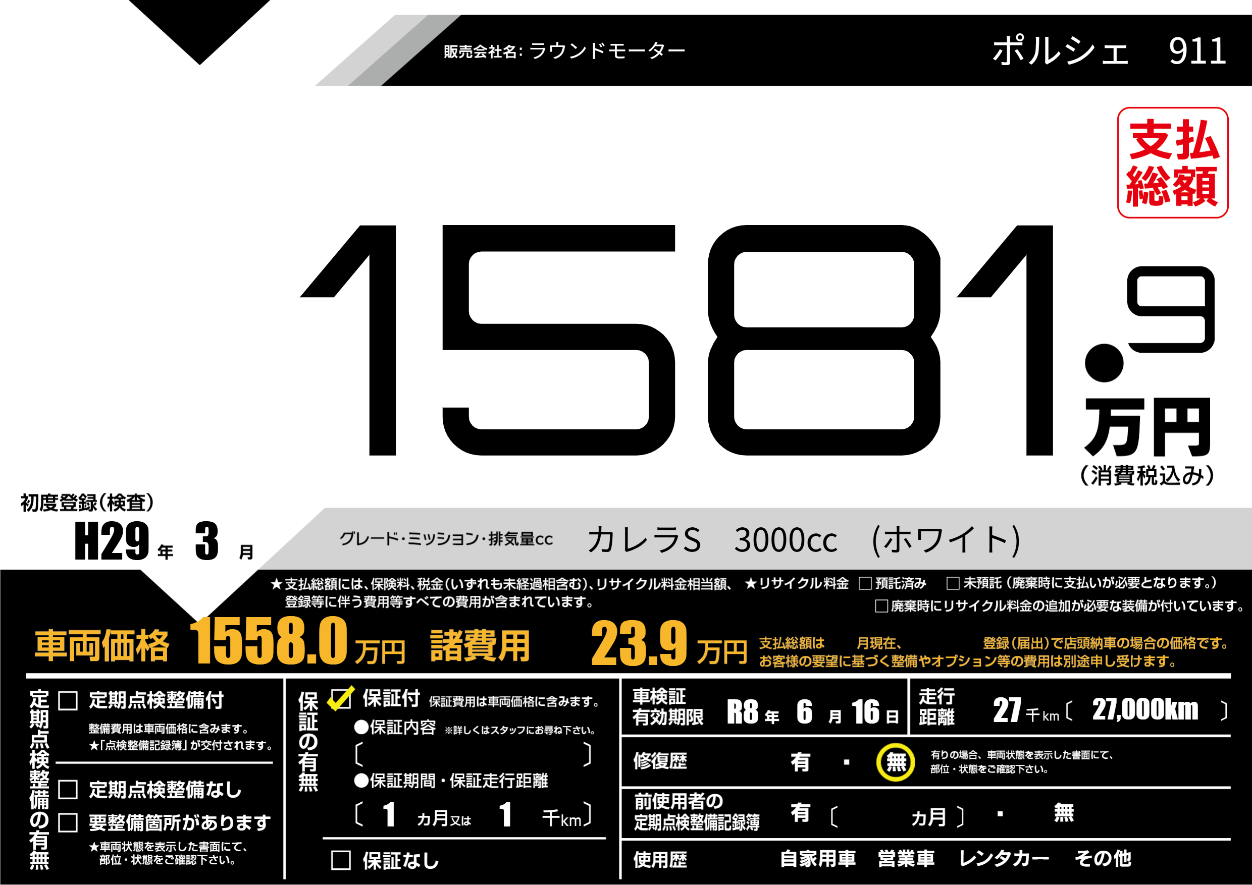 | 車名 | ポルシェ 911 | グレード ミッション 排気量 |