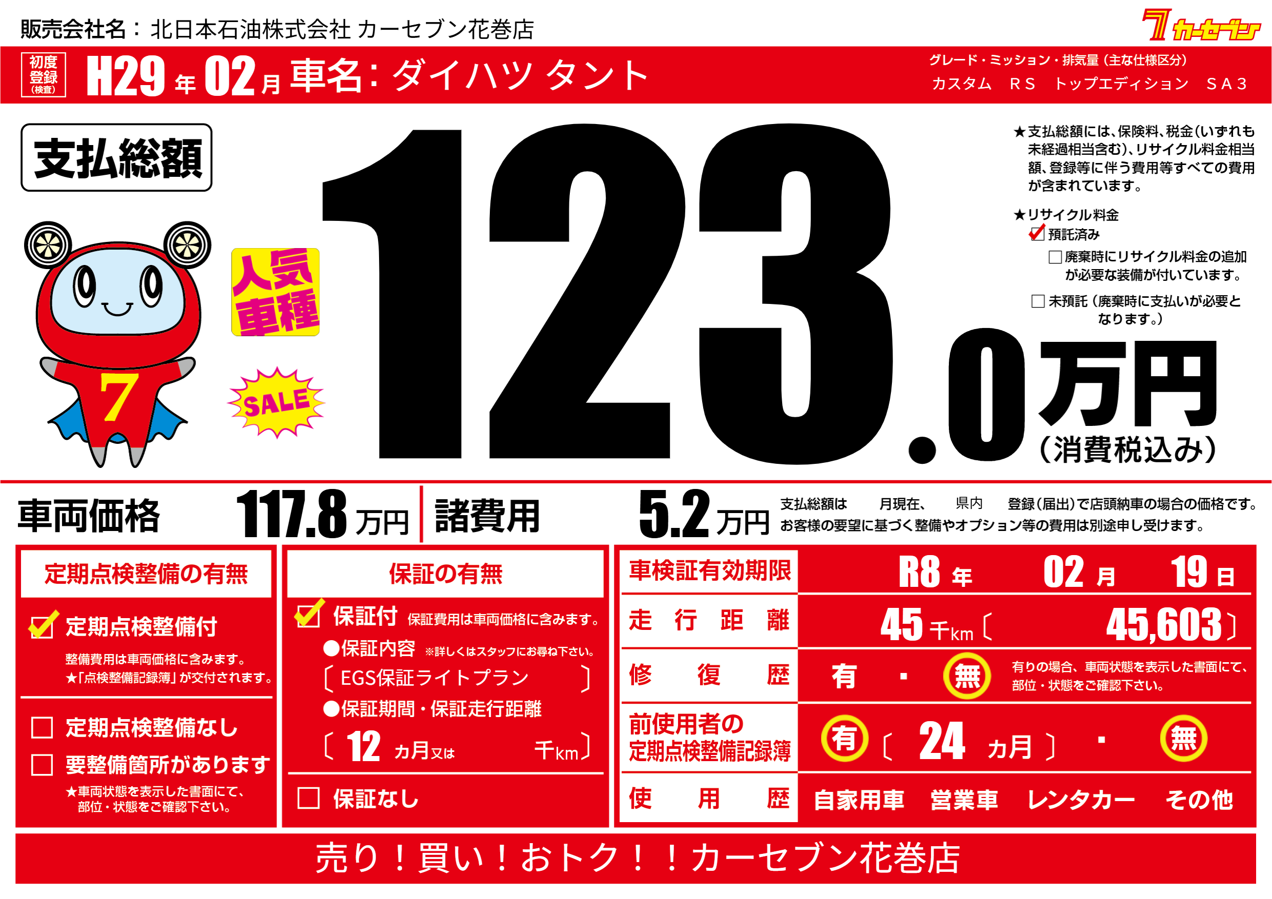 | 走行キロ | 4.5万km | 初年度登録 | H29年02月 |