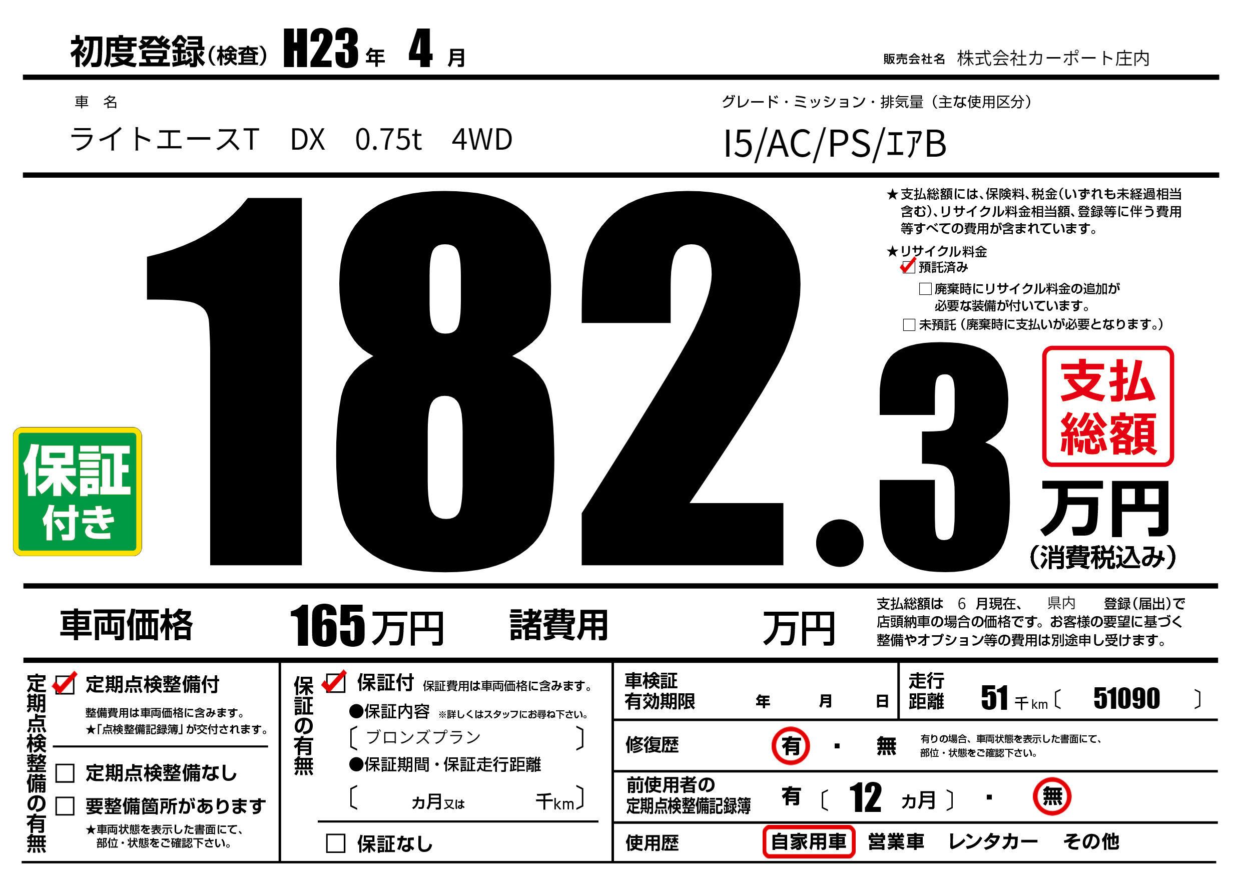 | 車名 | ライトエースT DX 0.75t 4WD | グレード ミッション 排気量 |