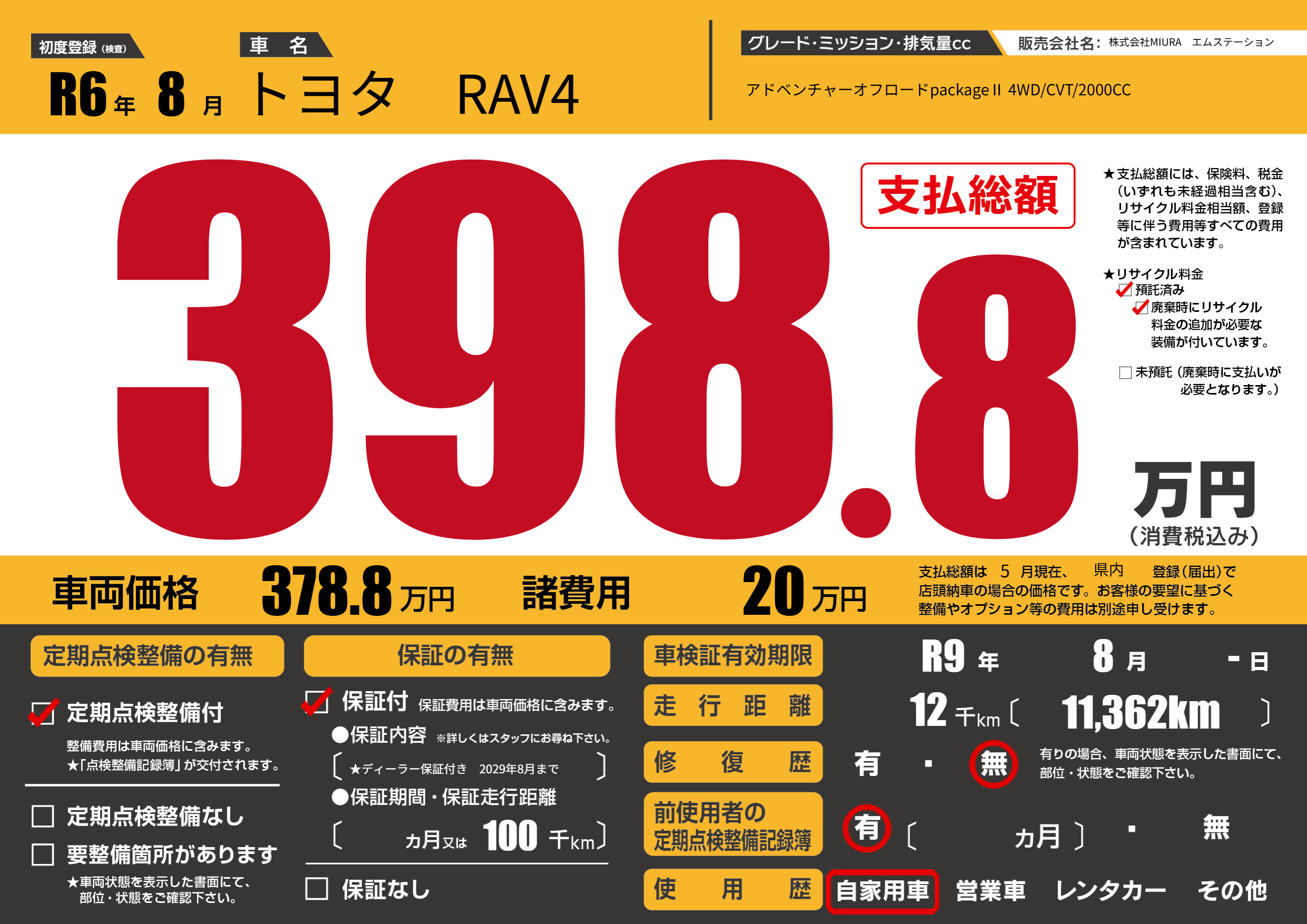 | 車名 | トヨタ RAV4 | グレード ミッション 排気量 |
