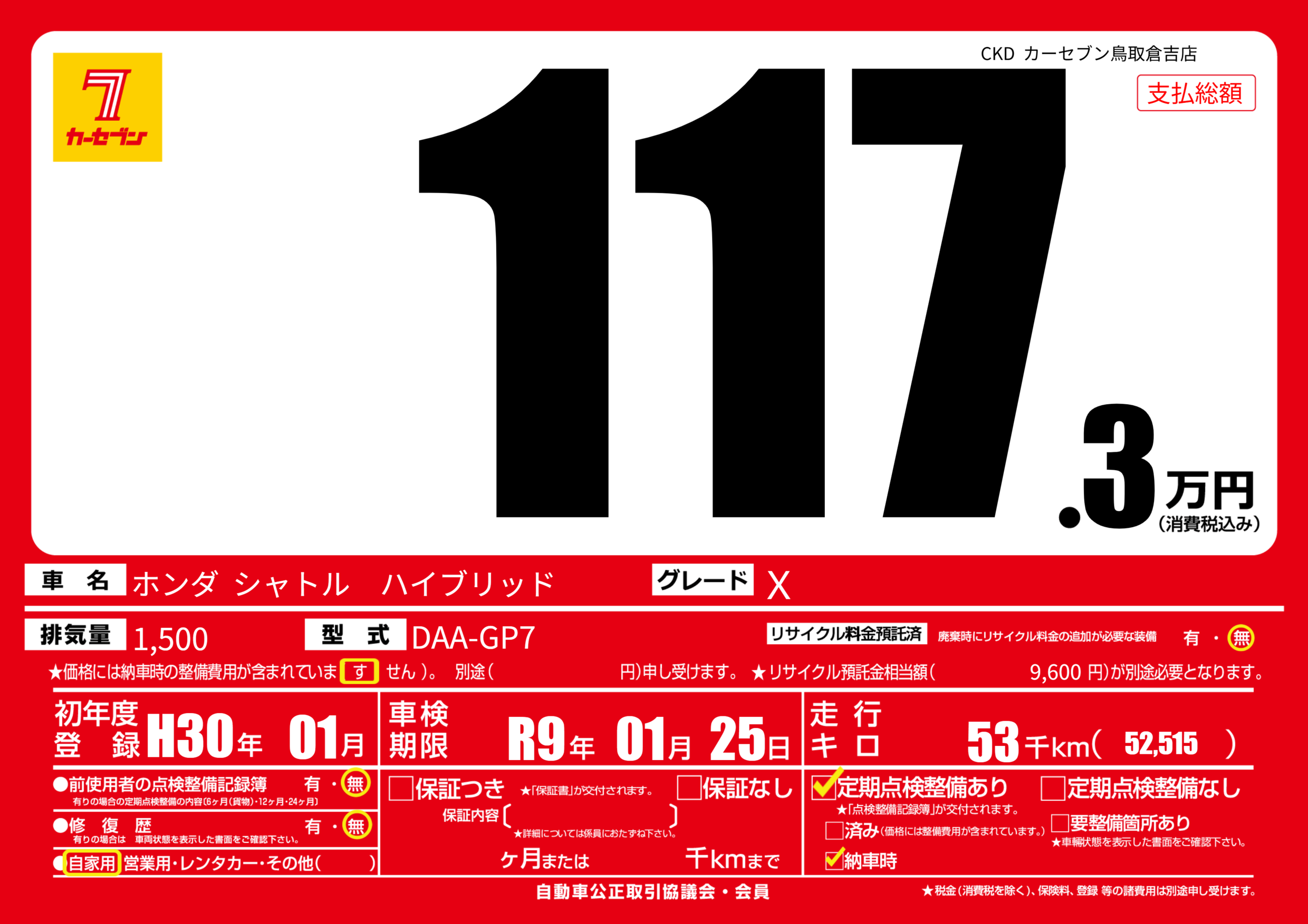| 車名 | ホンダ シャトル ハイブリッド | グレード ミッション 排気量 |