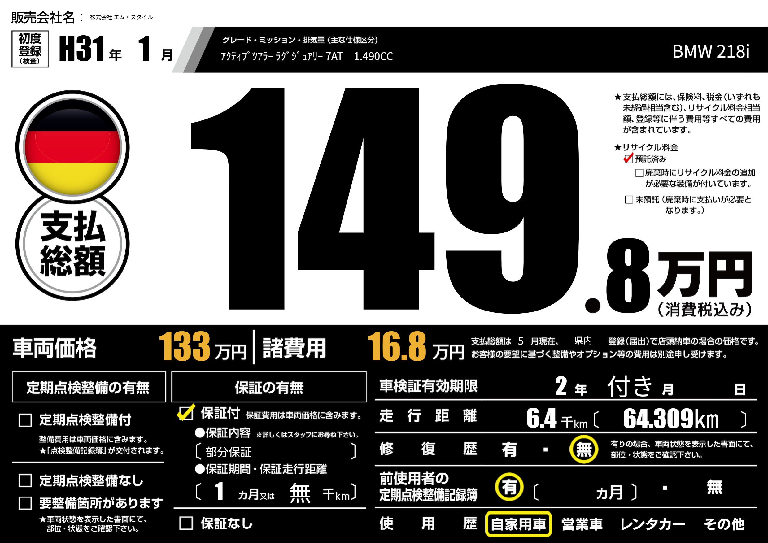 | 車名 | BMW 218i | グレード ミッション 排気量 |