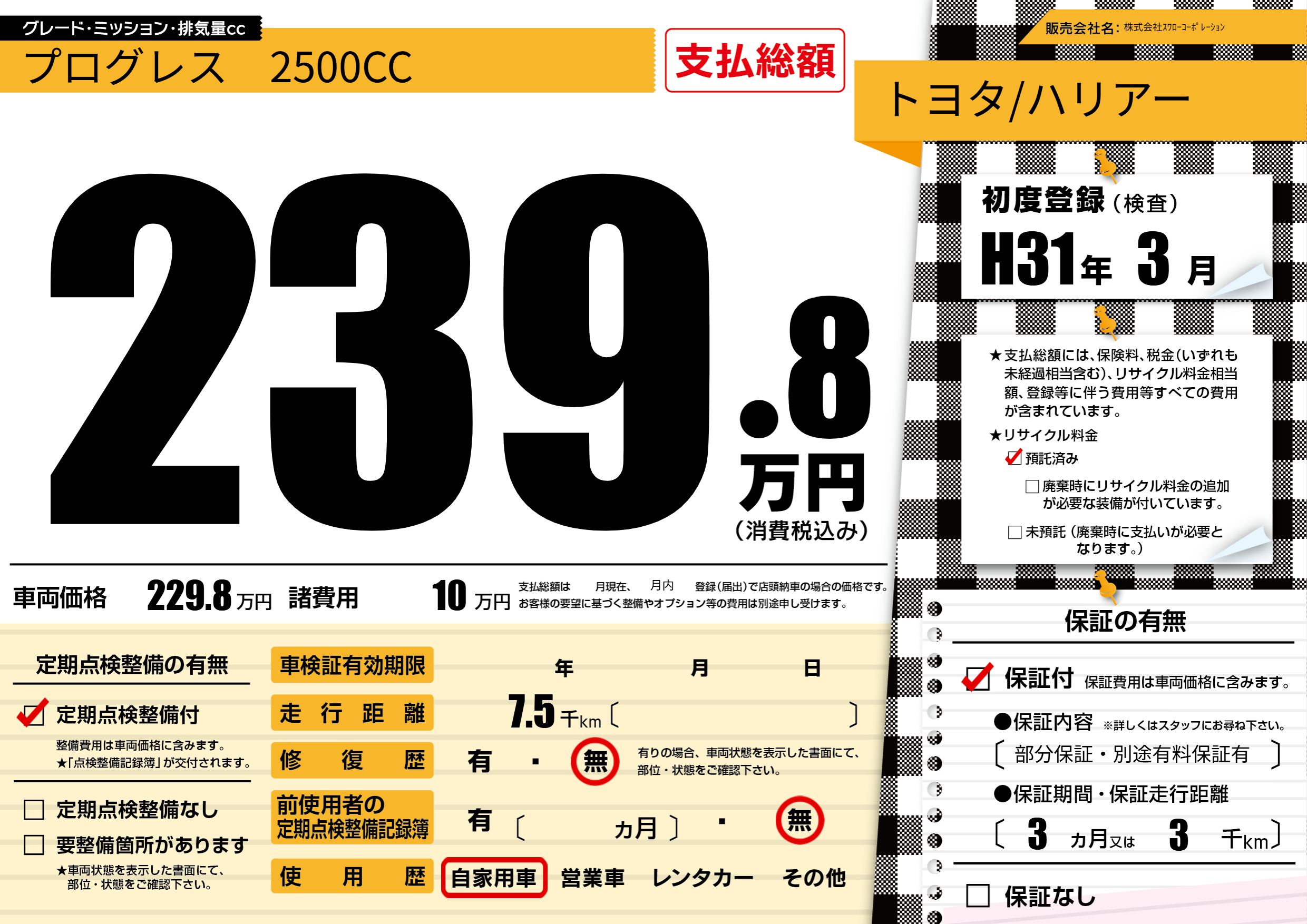 | 車名 | トヨタ/ハリアー | グレード ミッション 排気量 |