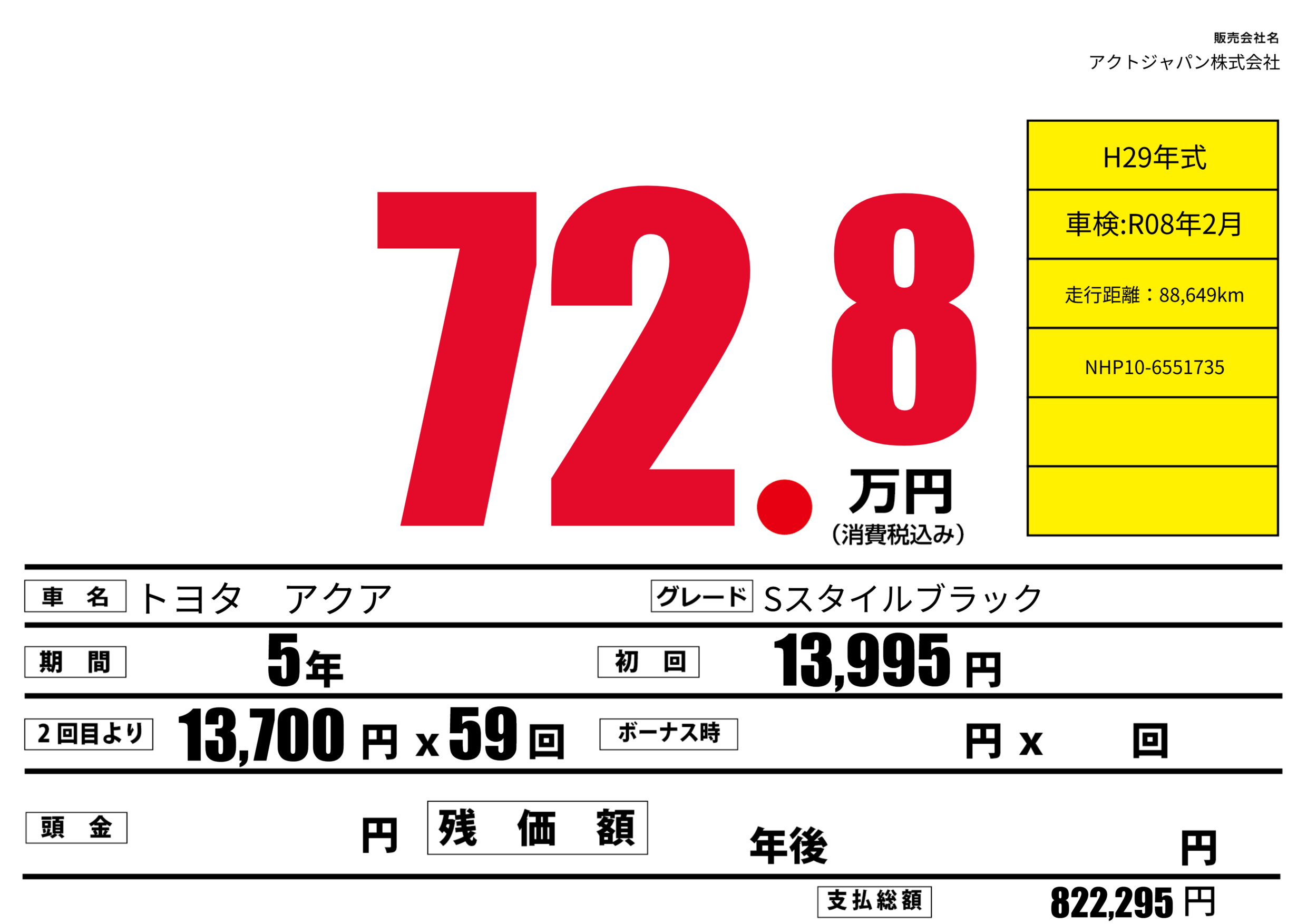 | 車名 | トヨタ アクア | グレード ミッション 排気量 |