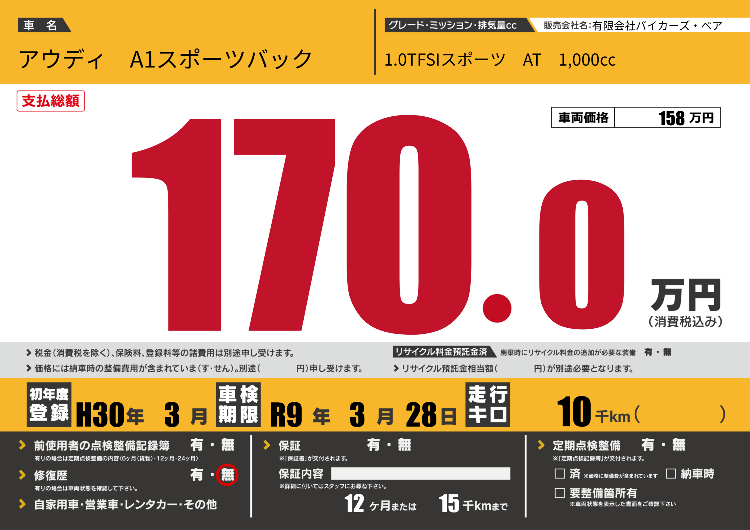 | 車名 | アウディ A1スポーツバック | グレード ミッション 排気量 |