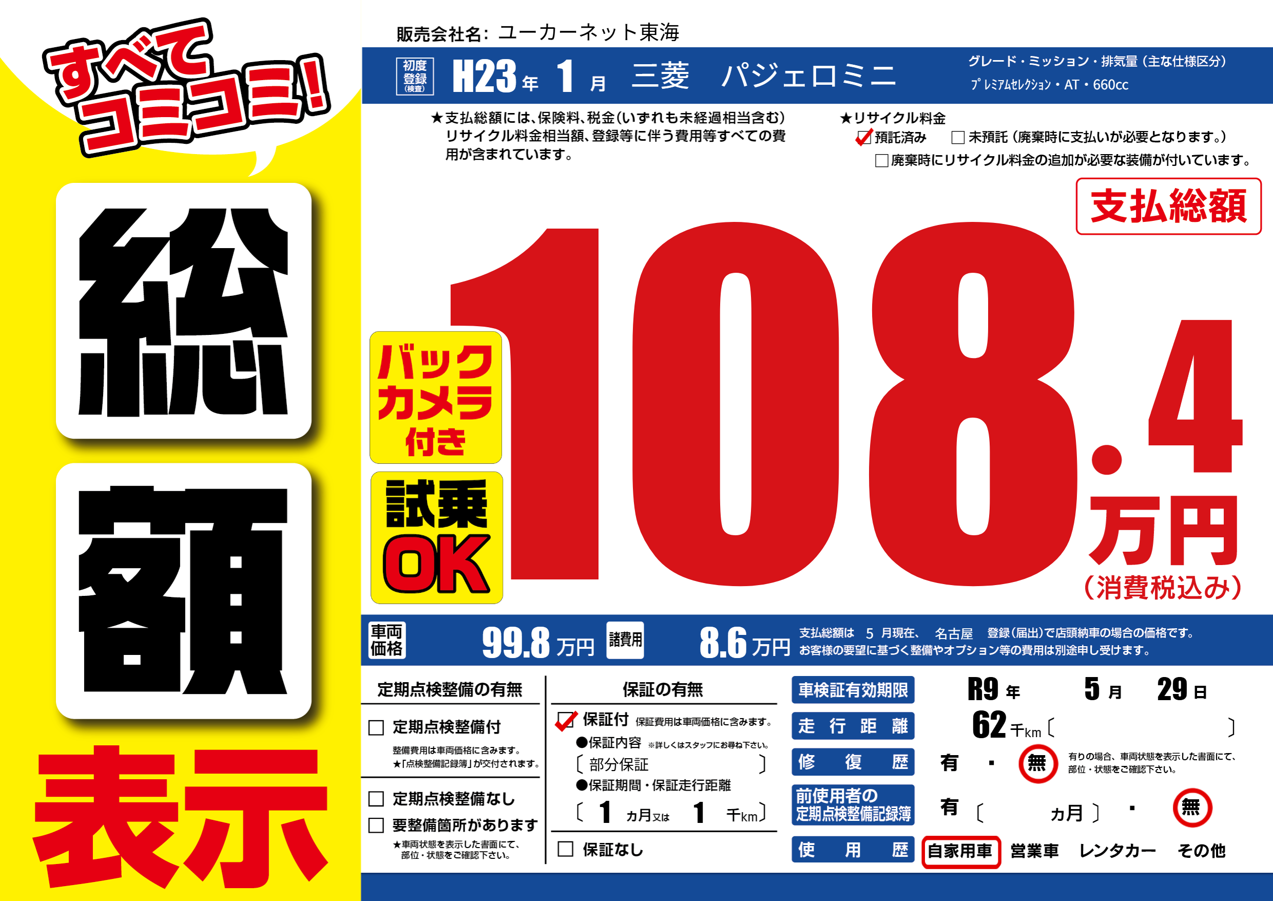 | 車名 | 三菱 パジェロミニ | グレード ミッション 排気量 |