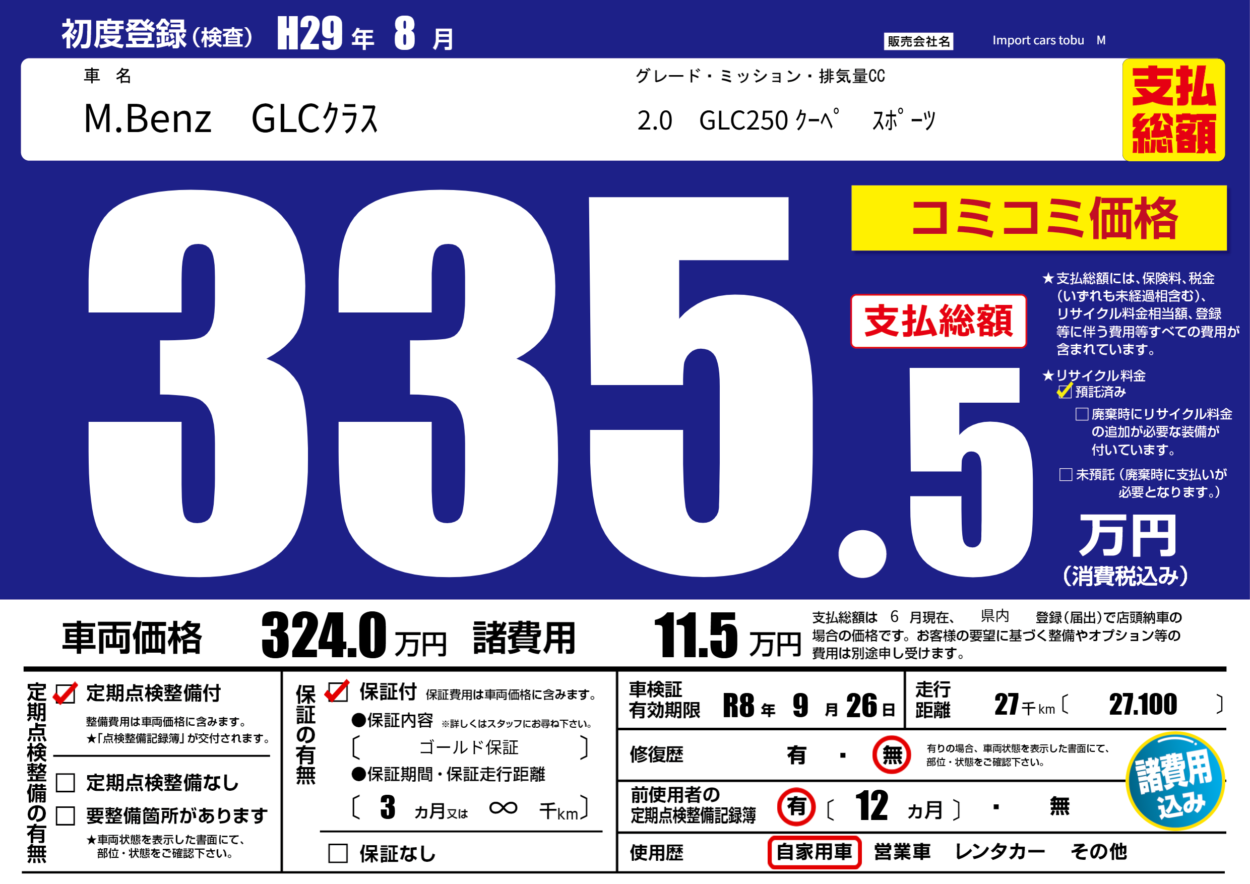 | 車名 | M.Benz GLCクラス | グレード ミッション 排気量 |