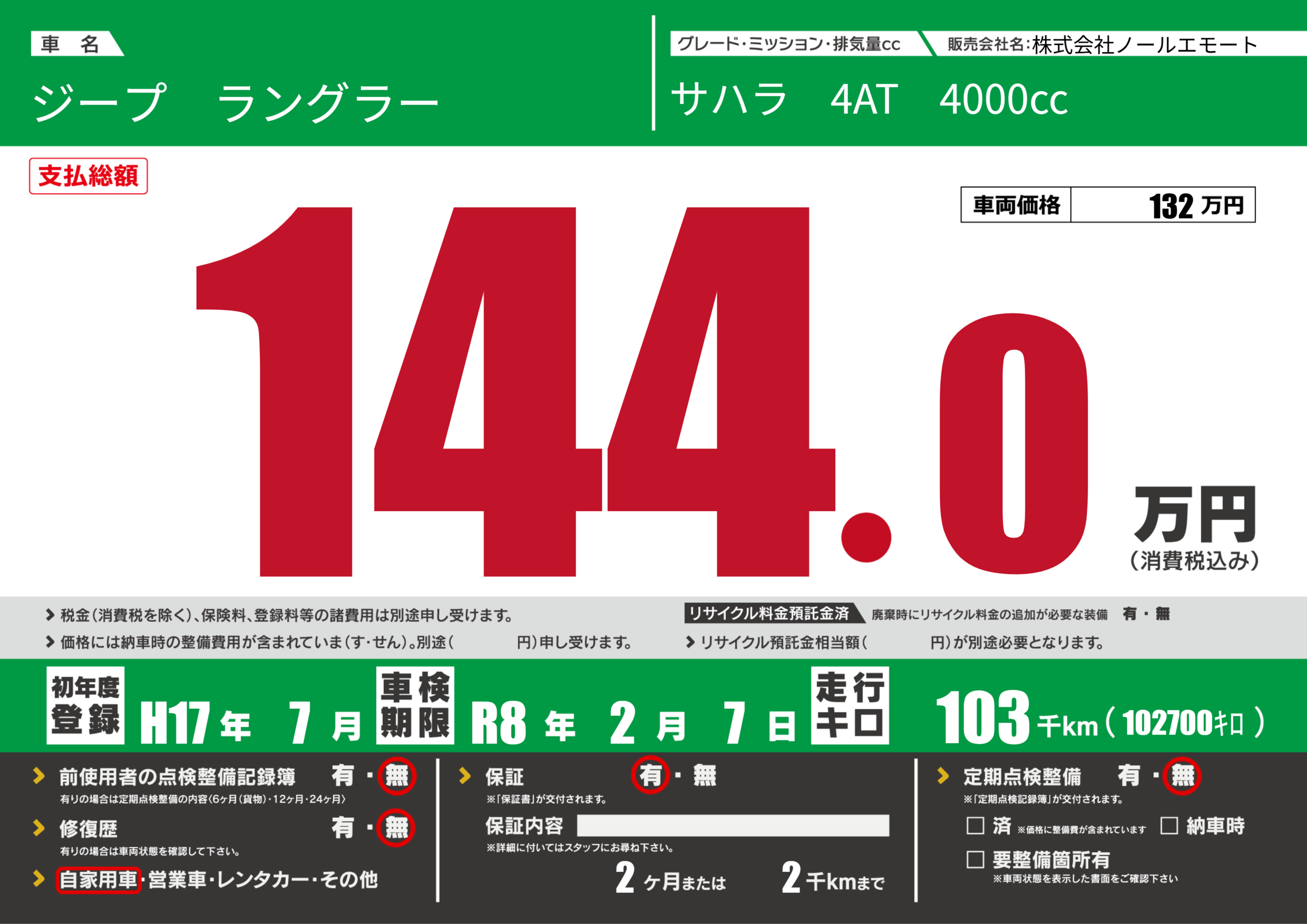 | 走行キロ | 10.3万km | 初年度登録 | H17年7月 |