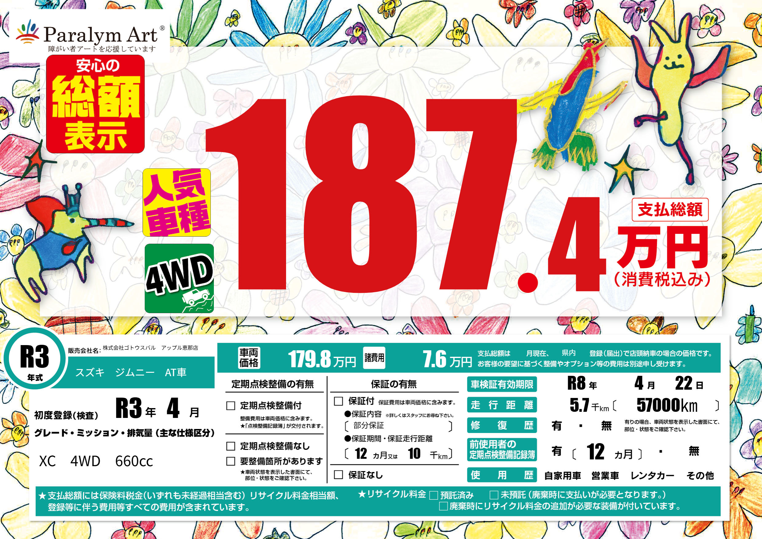 | 車名 | スズキ ジムニー AT車 | グレード ミッション 排気量 |