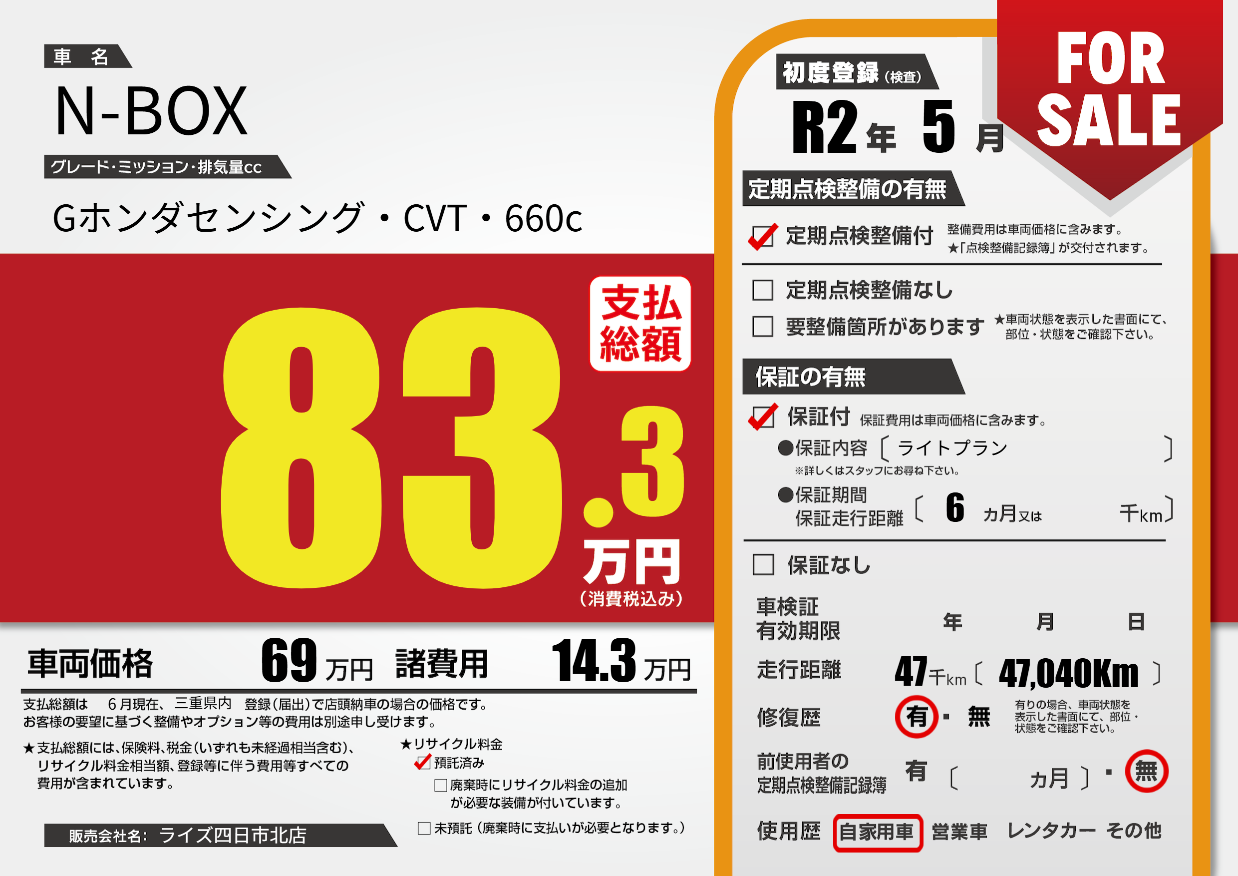 | 車名 | N-BOX | グレード ミッション 排気量 |