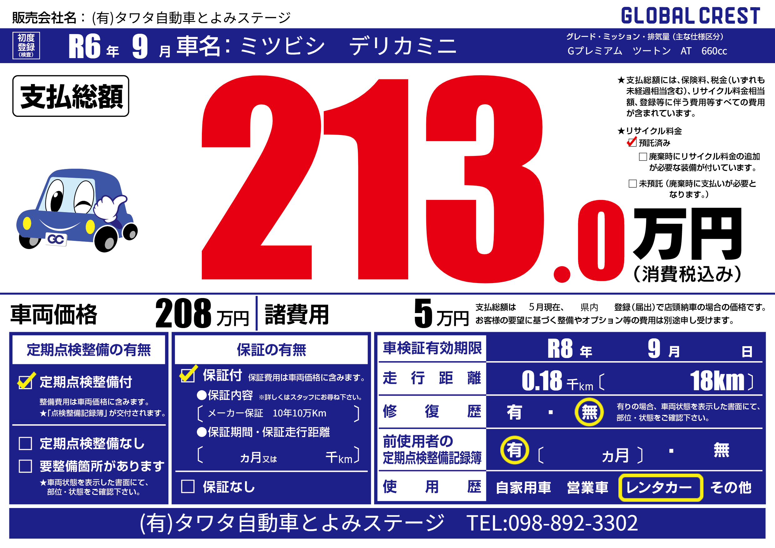 | 車名 | ミツビシ デリカミニ | グレード ミッション 排気量 |