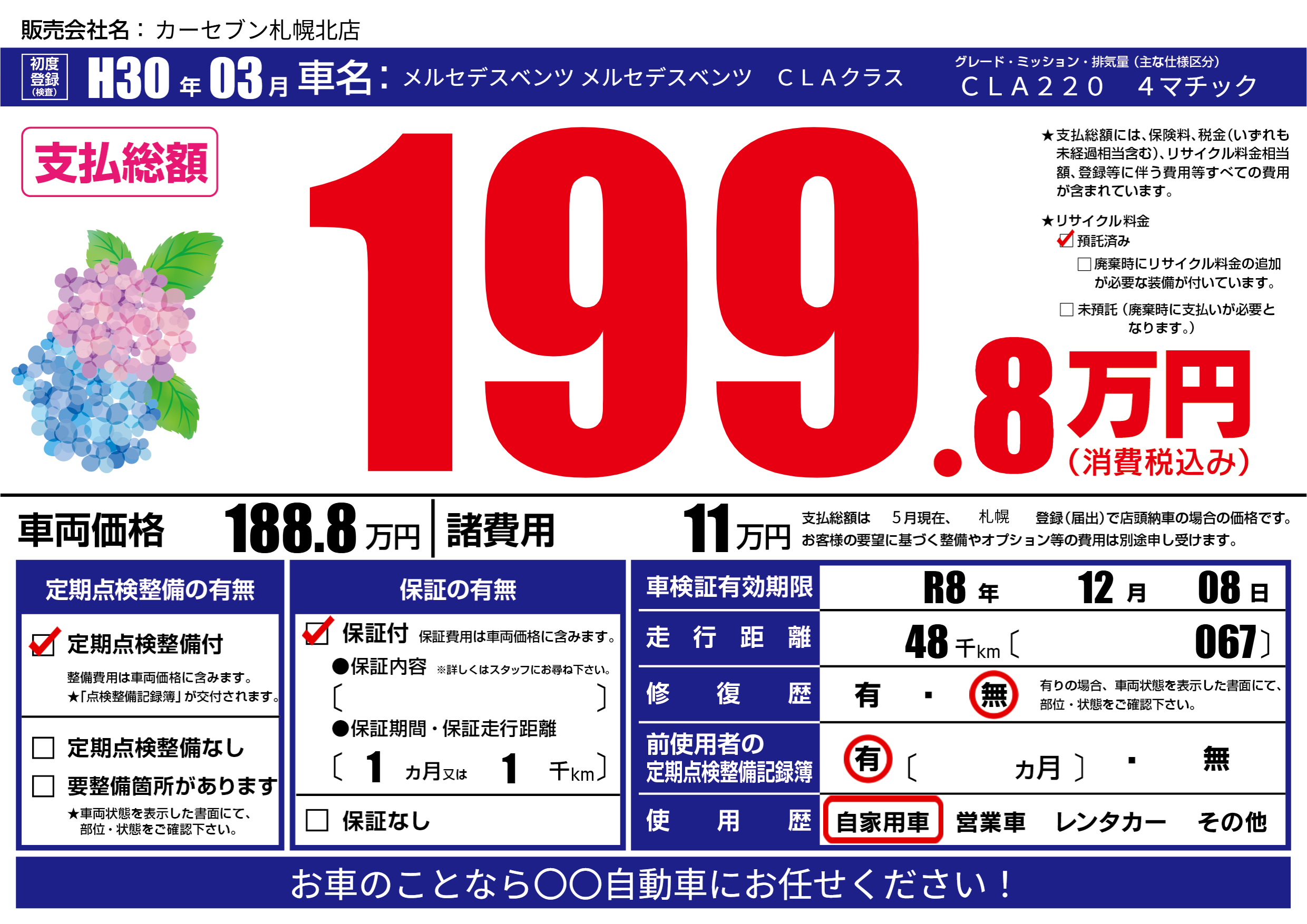 | 車名 | メルセデスベンツ メルセデスベンツ CLAクラス | グレード ミッション 排気量 |