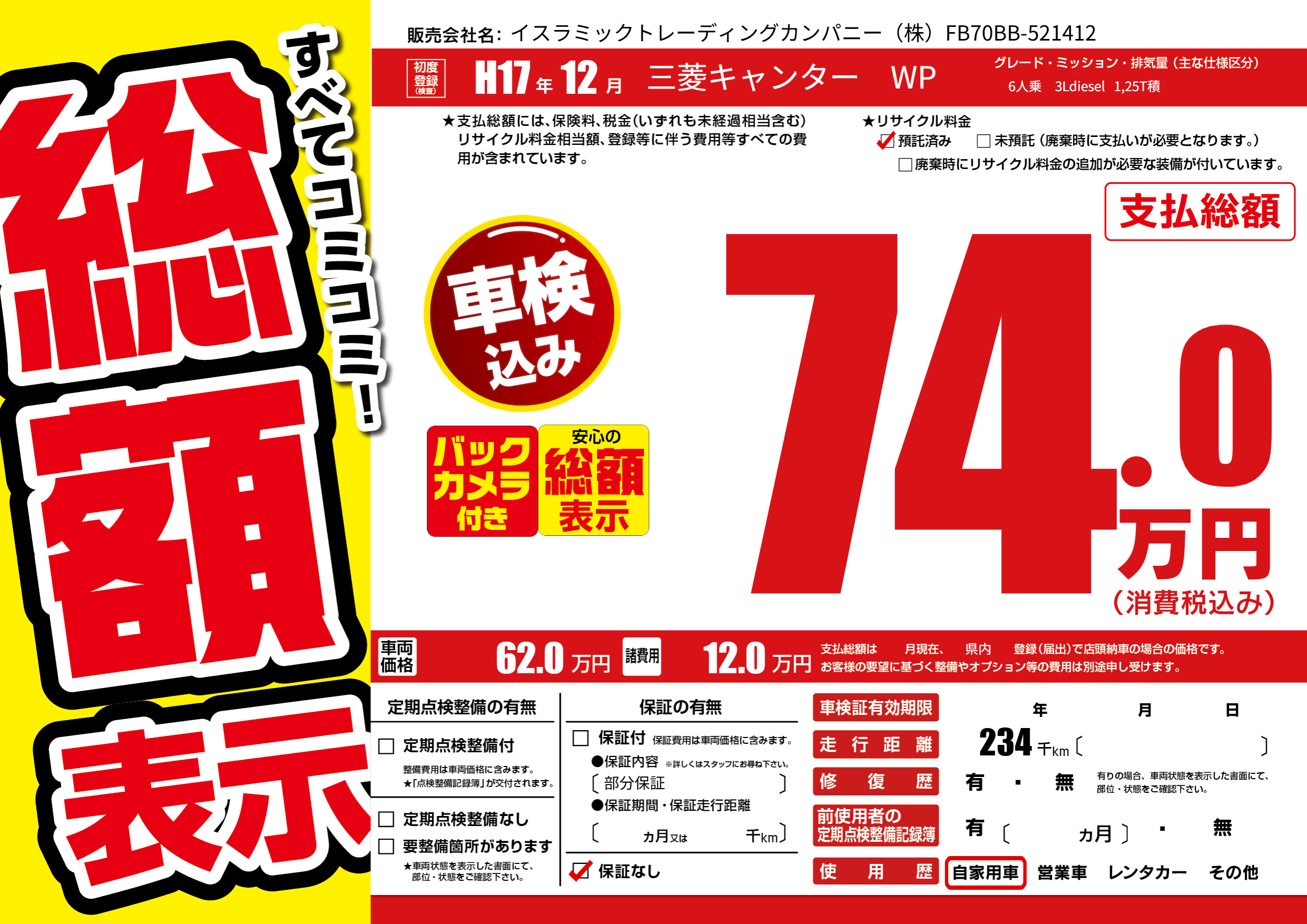 | 車名 | 三菱キャンター WP | グレード ミッション 排気量 |