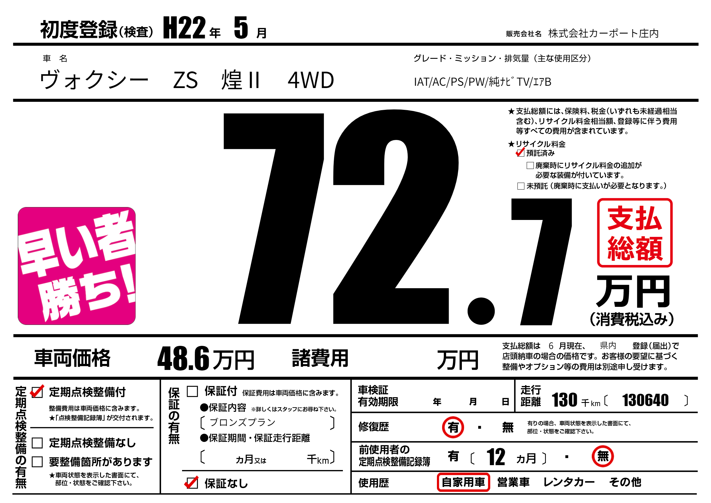 | 走行キロ | 13万km | 初年度登録 | H22年5月 |