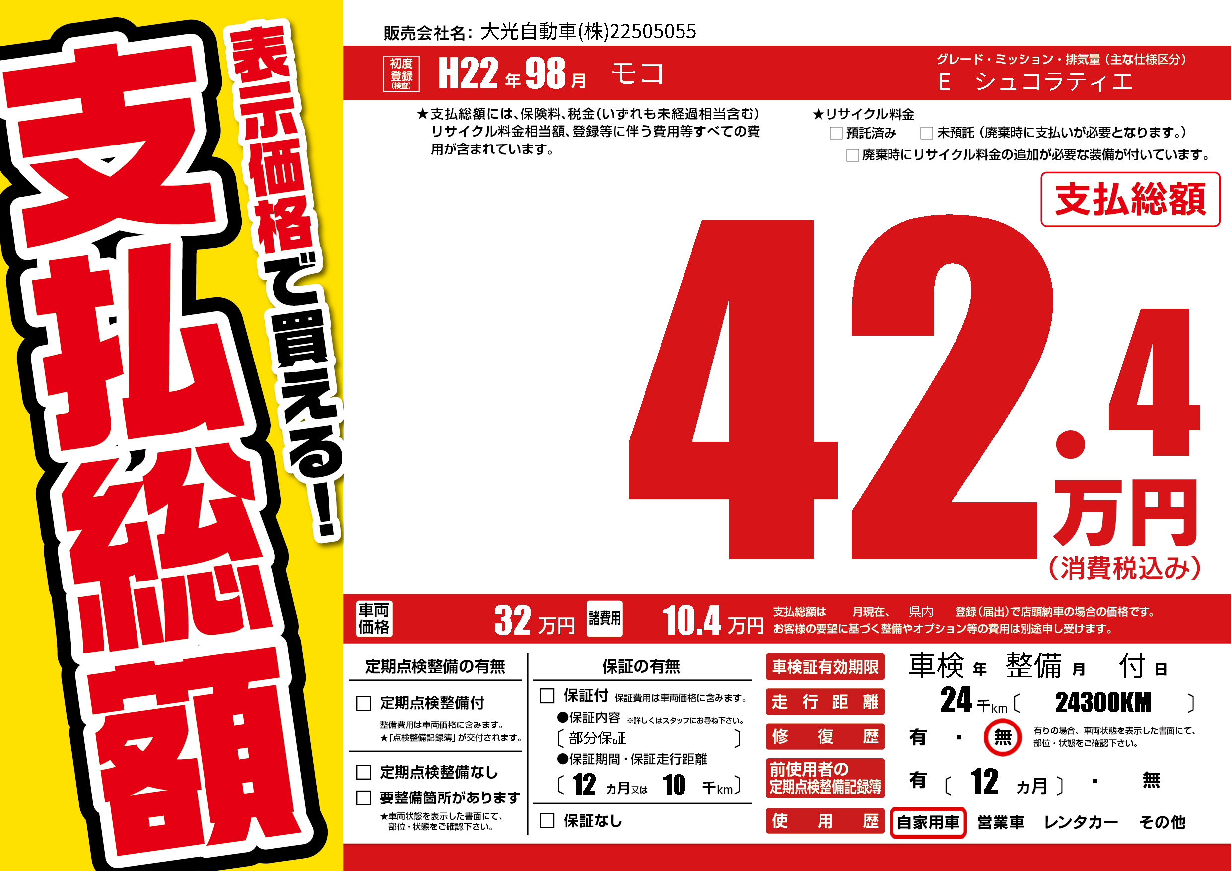 | 走行キロ | 2.4万km | 初年度登録 | H22年98月 |