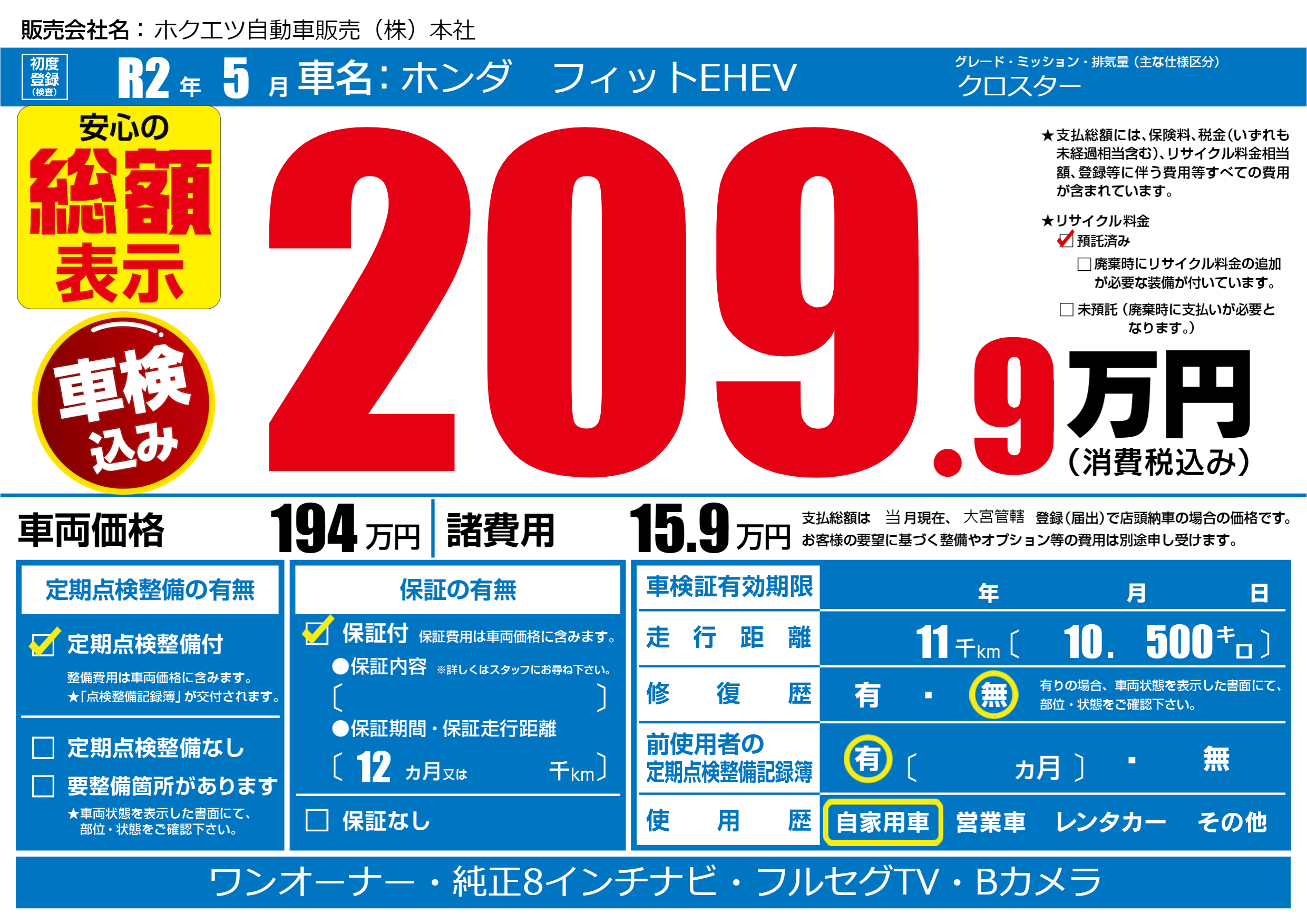 | 車名 | ホンダ フィットEHEV | グレード ミッション 排気量 |