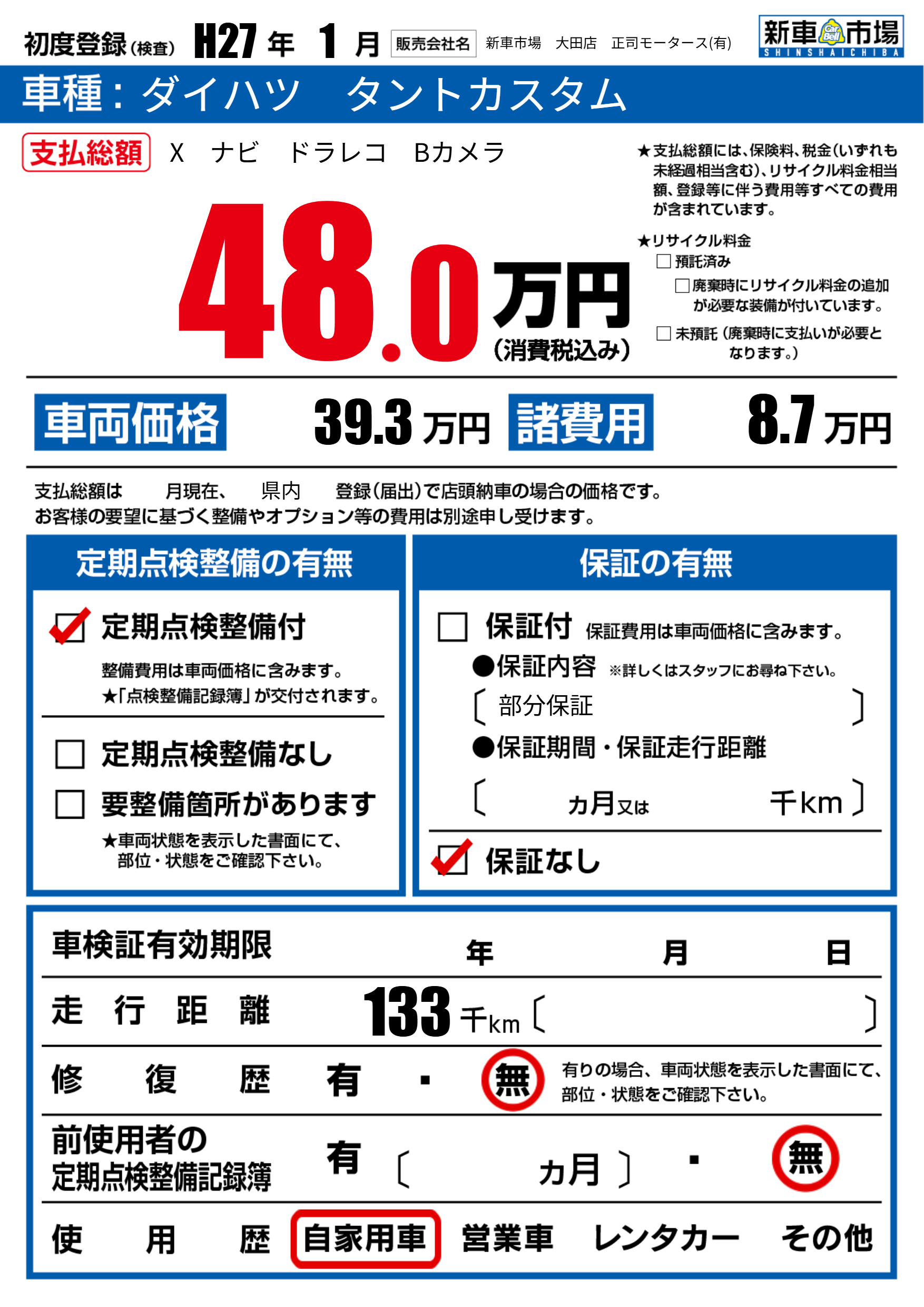 | 走行キロ | 13.3万km | 初年度登録 | H27年1月 |