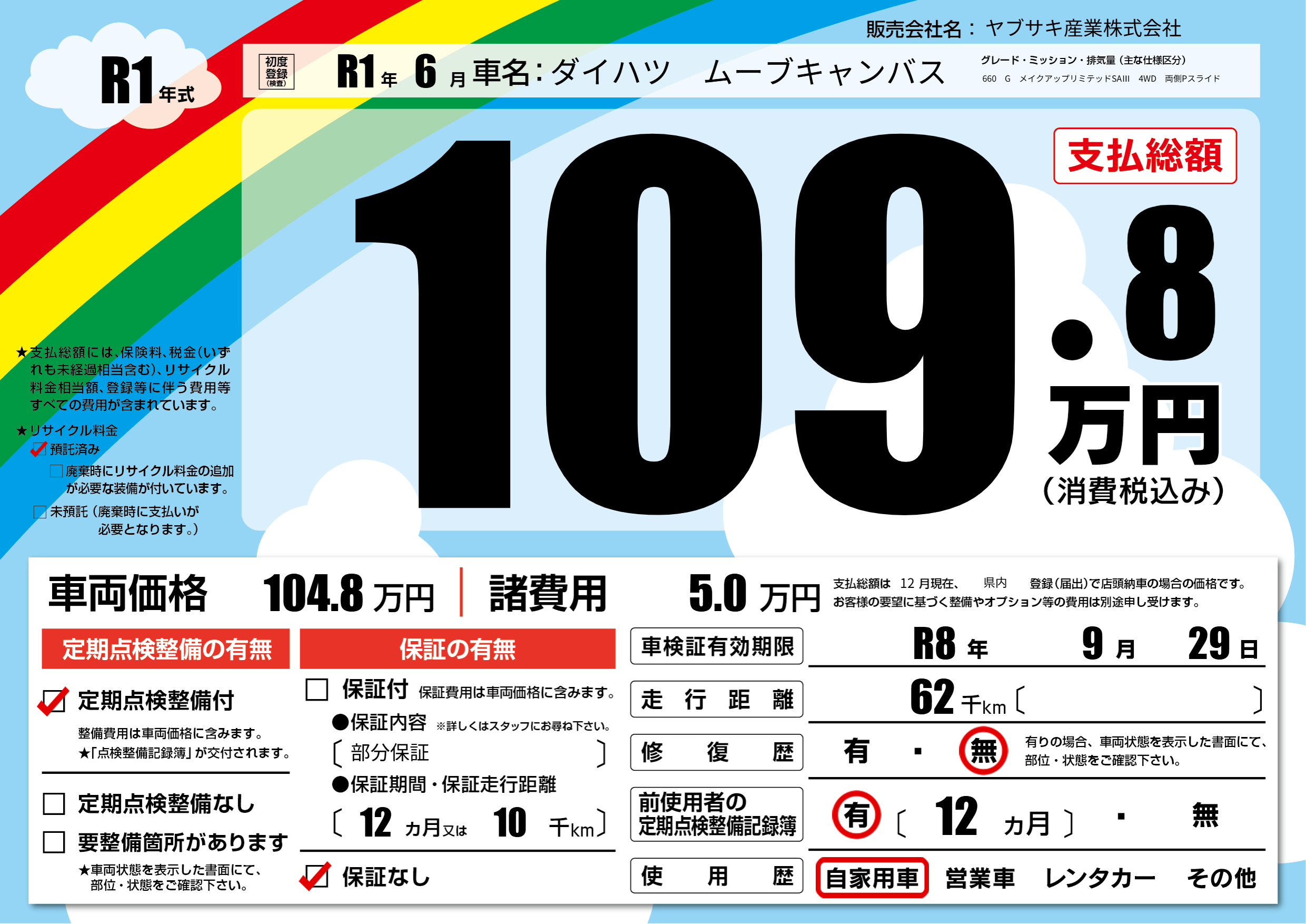 | 走行キロ | 6.2万km | 初年度登録 | R1年6月 |