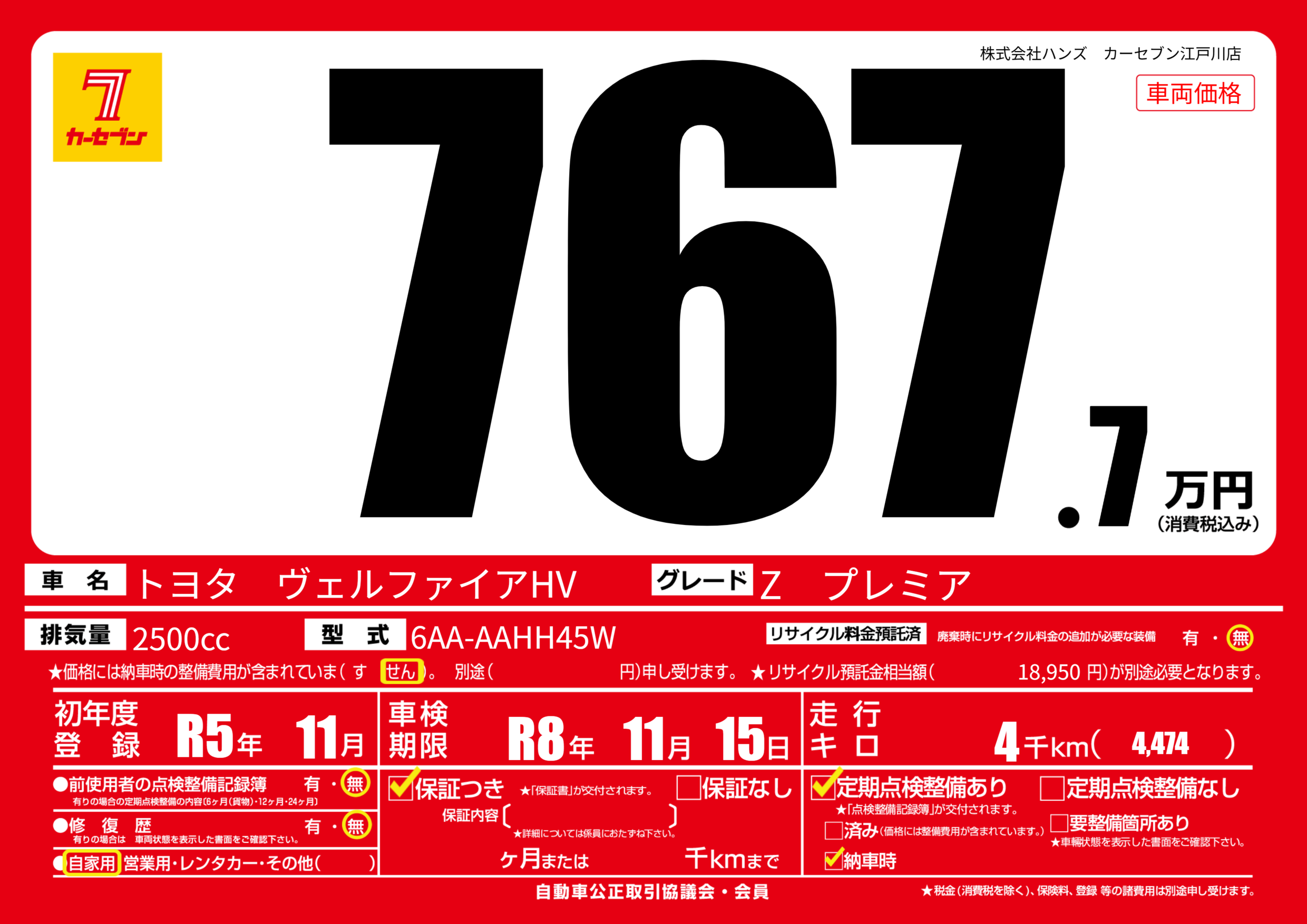 | 車名 | トヨタ ヴェルファイアHV | グレード ミッション 排気量 |