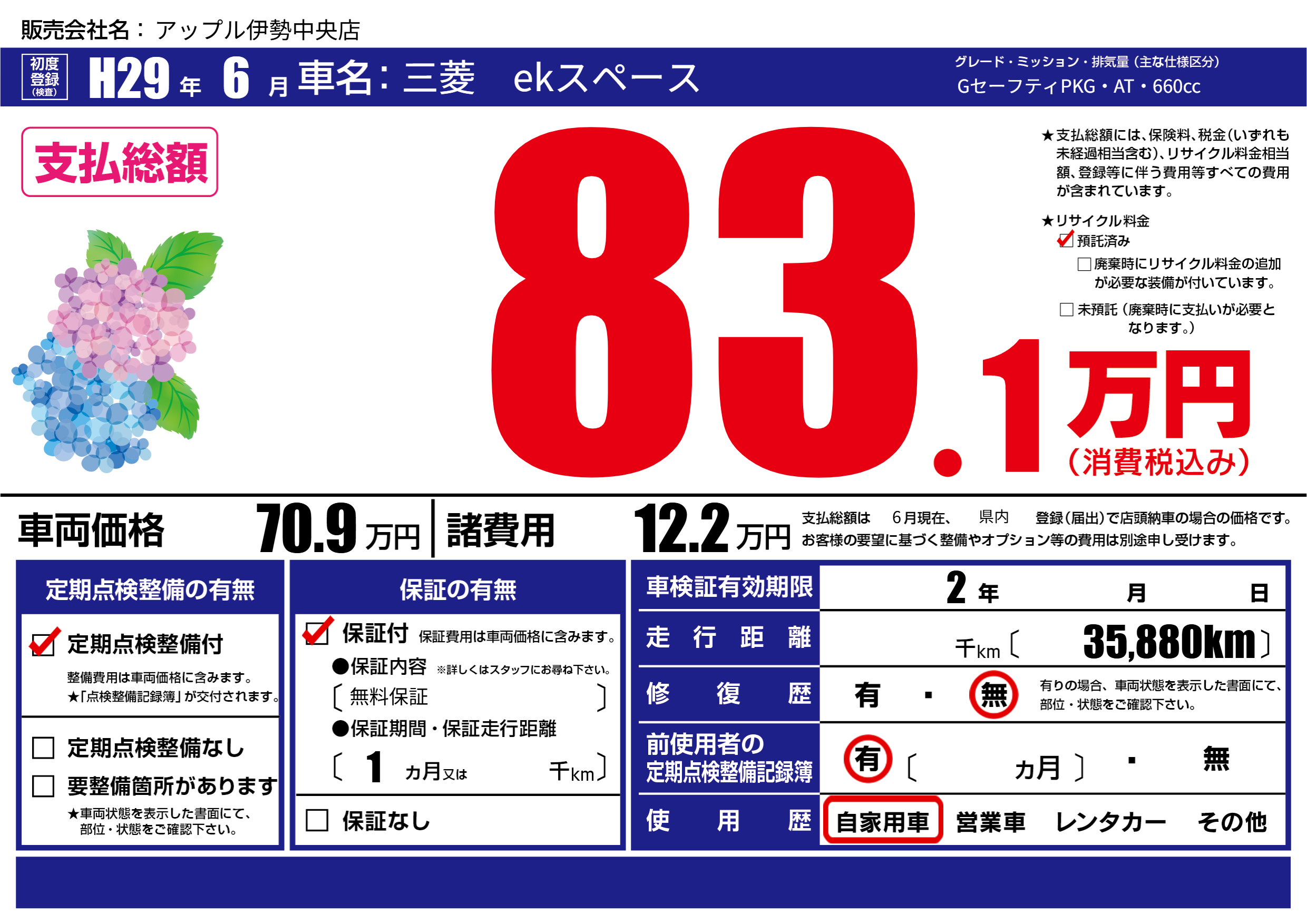 | 走行キロ | - | 初年度登録 | H29年6月 |