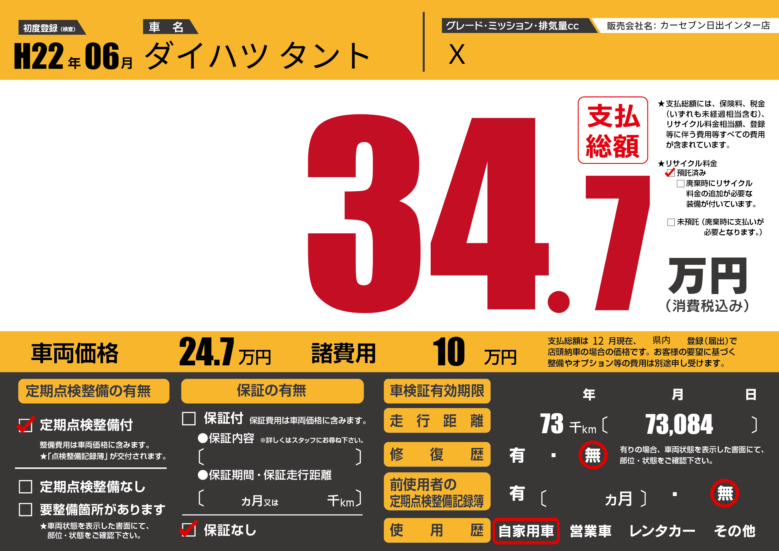 | 走行キロ | 7.3万km | 初年度登録 | H22年06月 |