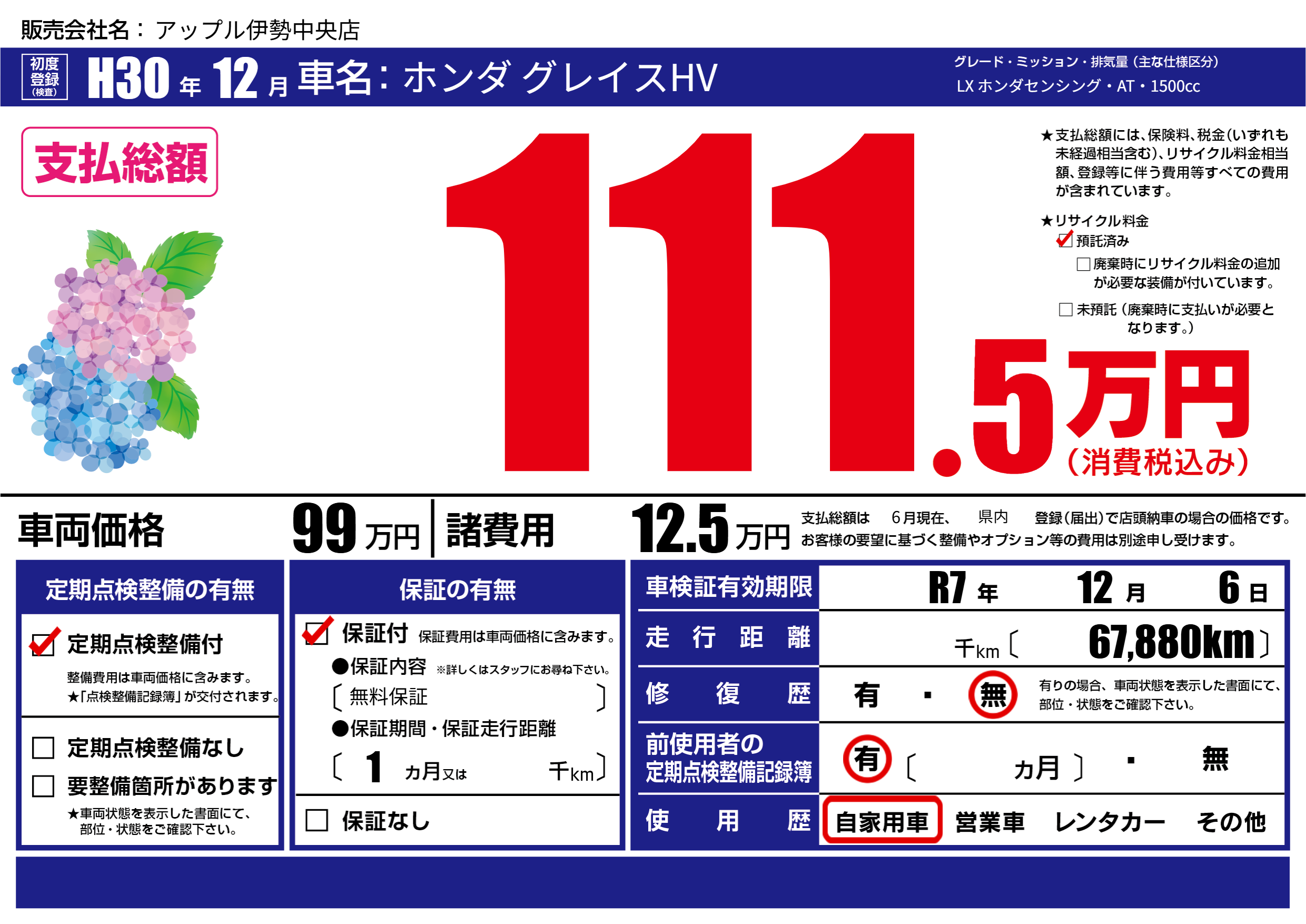 | 車名 | ホンダ グレイスHV | グレード ミッション 排気量 |