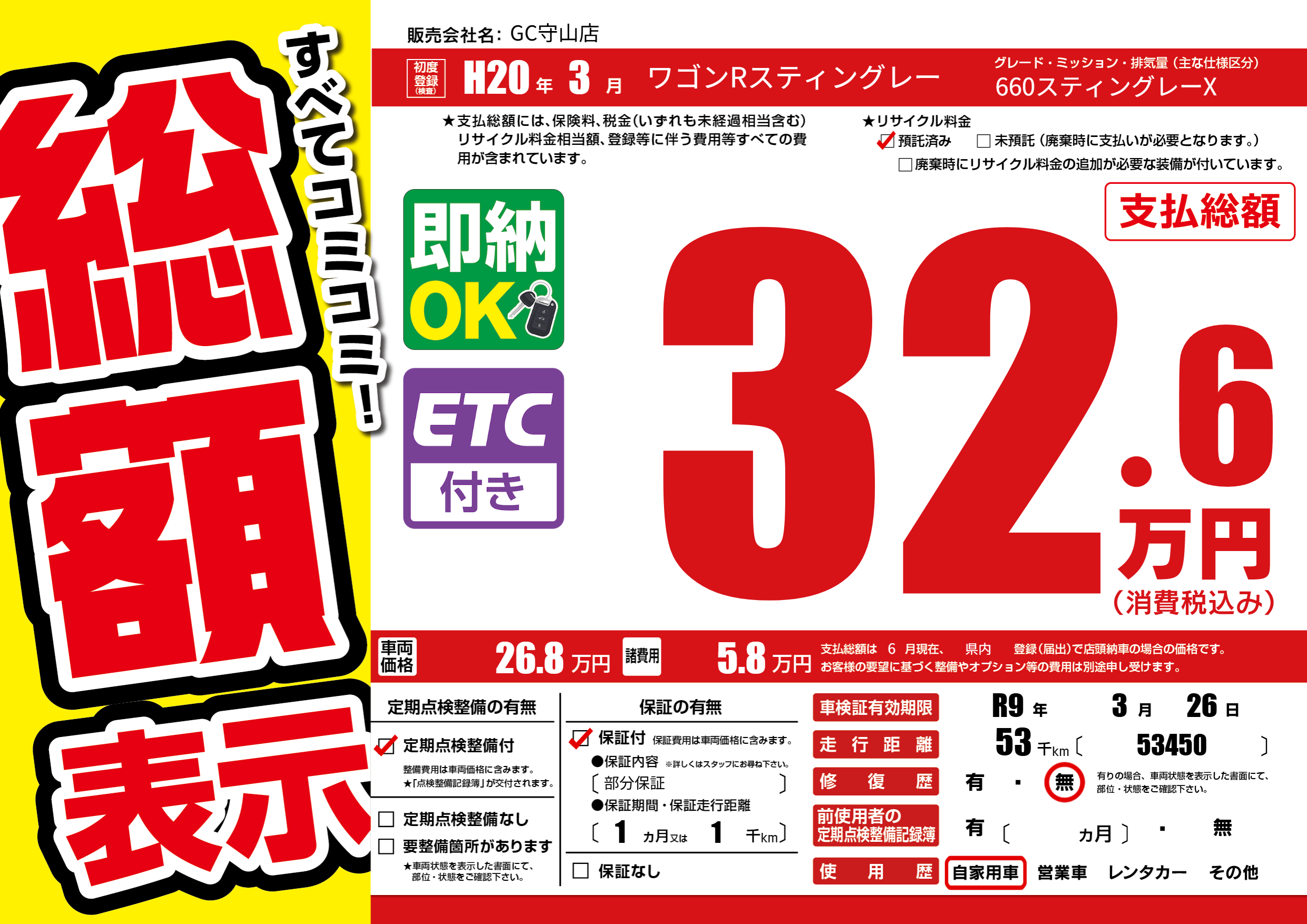 | 走行キロ | 5.3万km | 初年度登録 | H20年3月 |