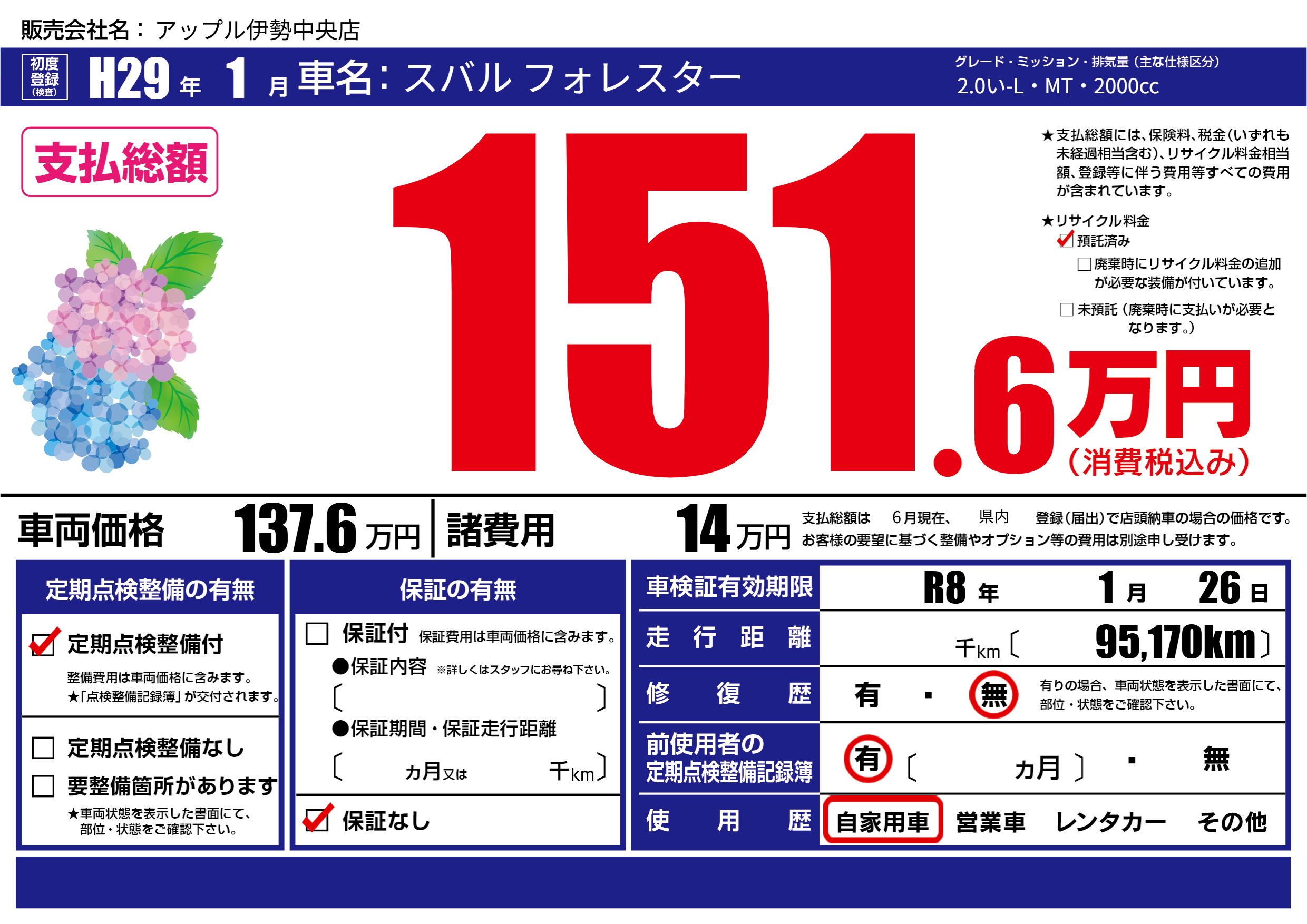 | 車名 | スバル フォレスター | グレード ミッション 排気量 |