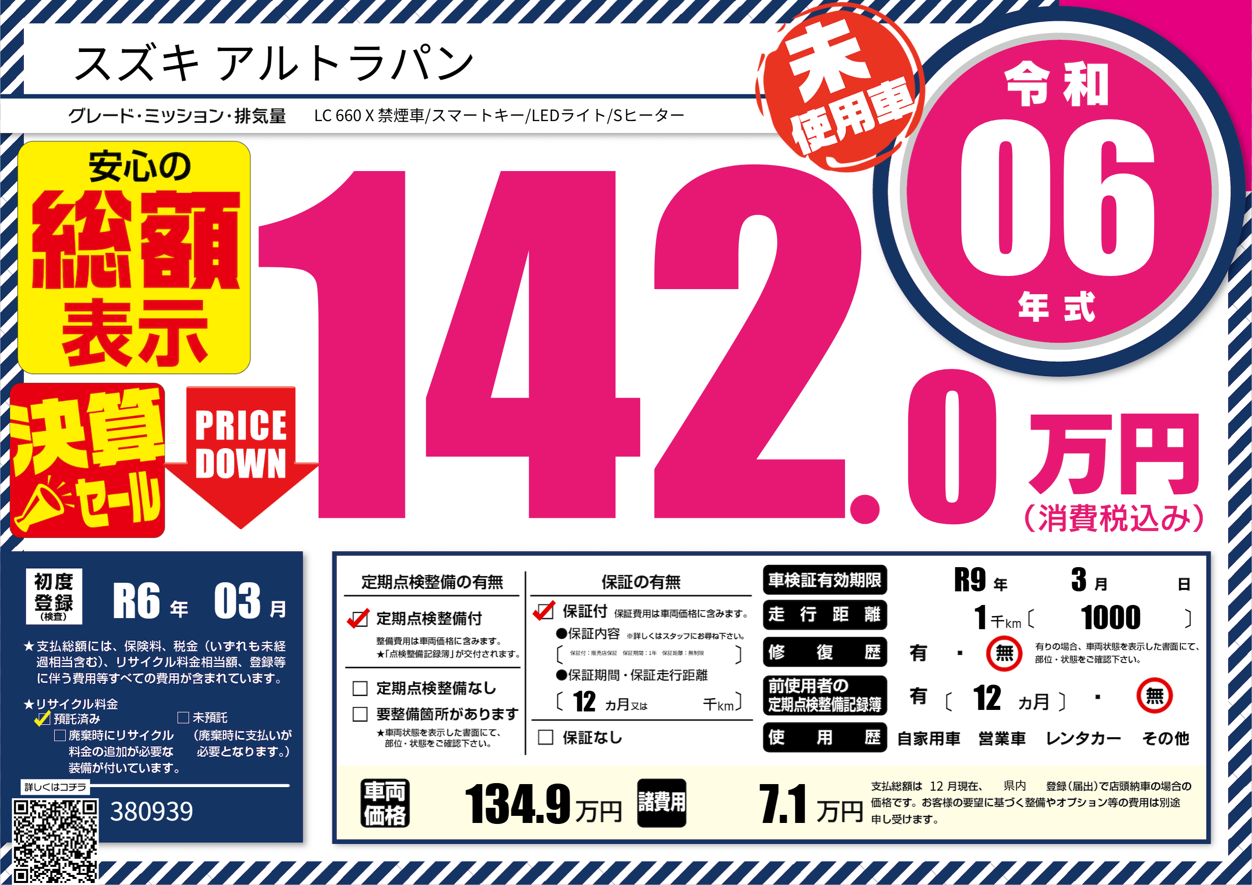 | 走行キロ | 0.1万km | 初年度登録 | R6年03月 |