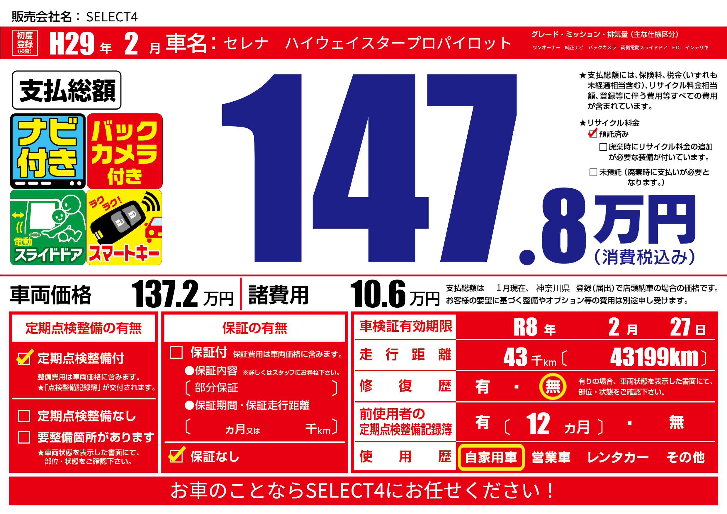 | 走行キロ | 4.3万km | 初年度登録 | H29年2月 |