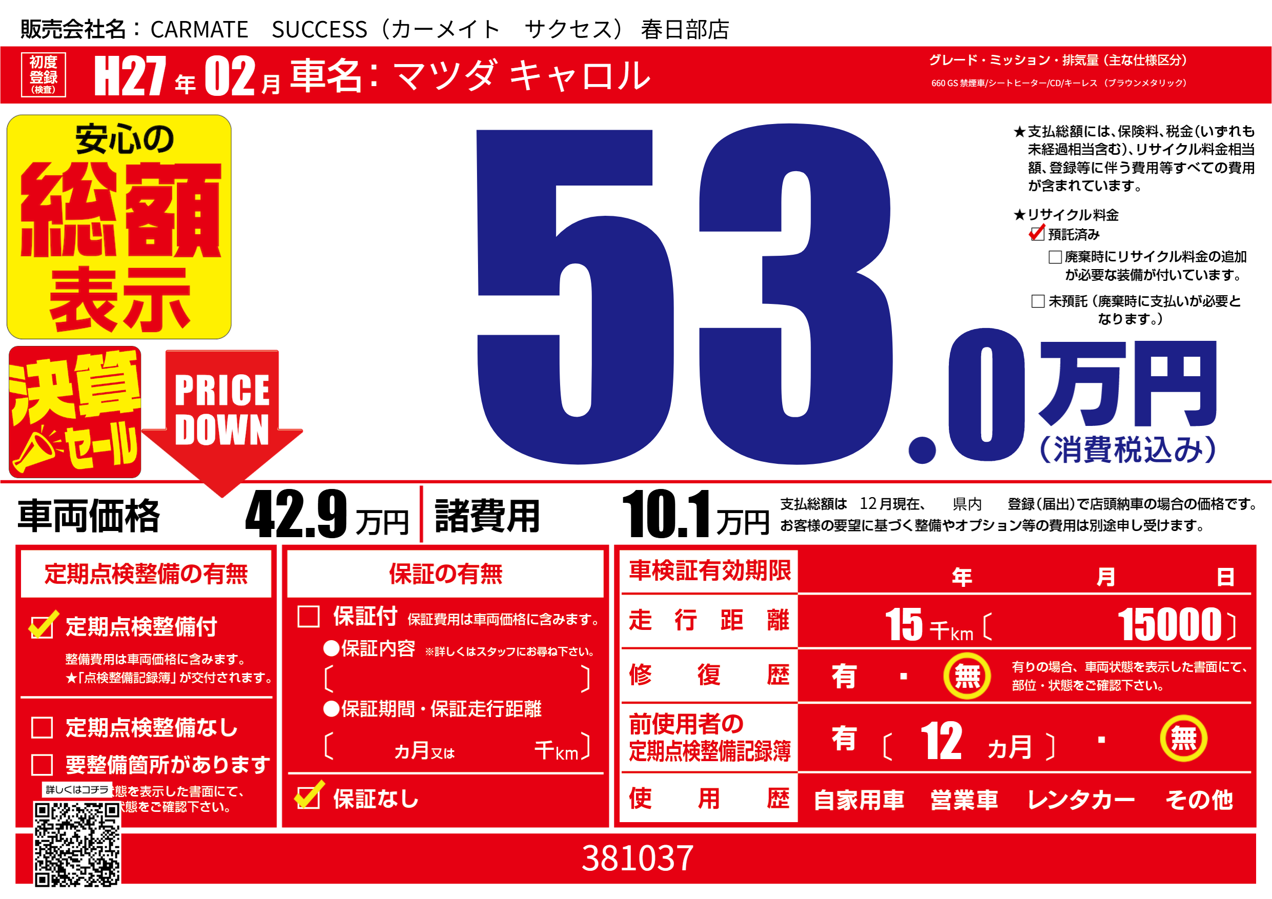 | 車名 | マツダ キャロル | グレード ミッション 排気量 |