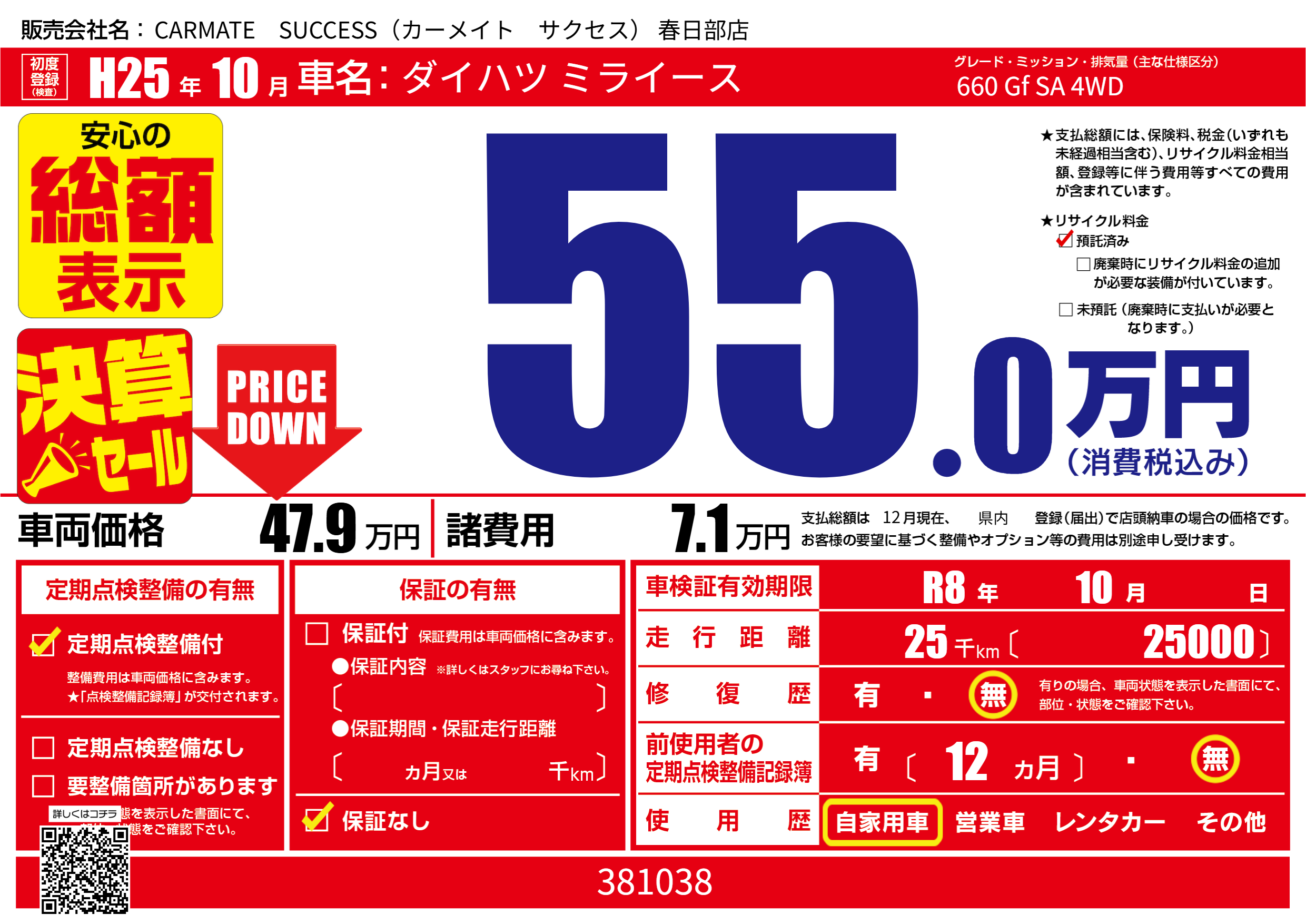 | 走行キロ | 2.5万km | 初年度登録 | H25年10月 |