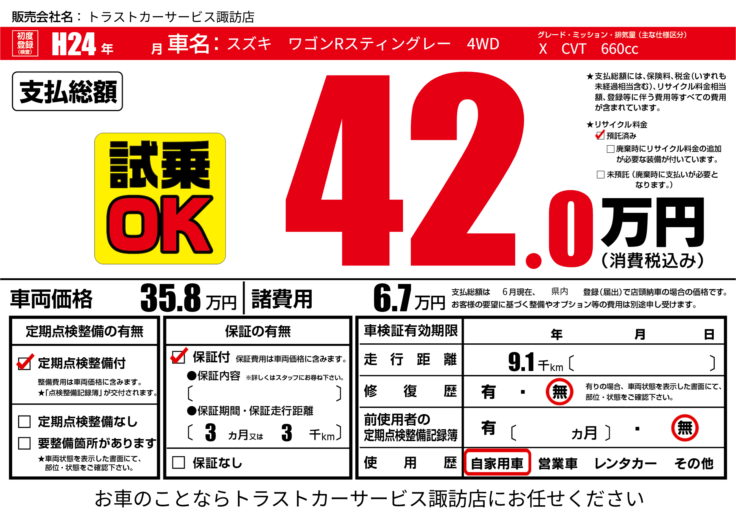 | 車名 | スズキ ワゴンRスティングレー 4WD | グレード ミッション 排気量 |