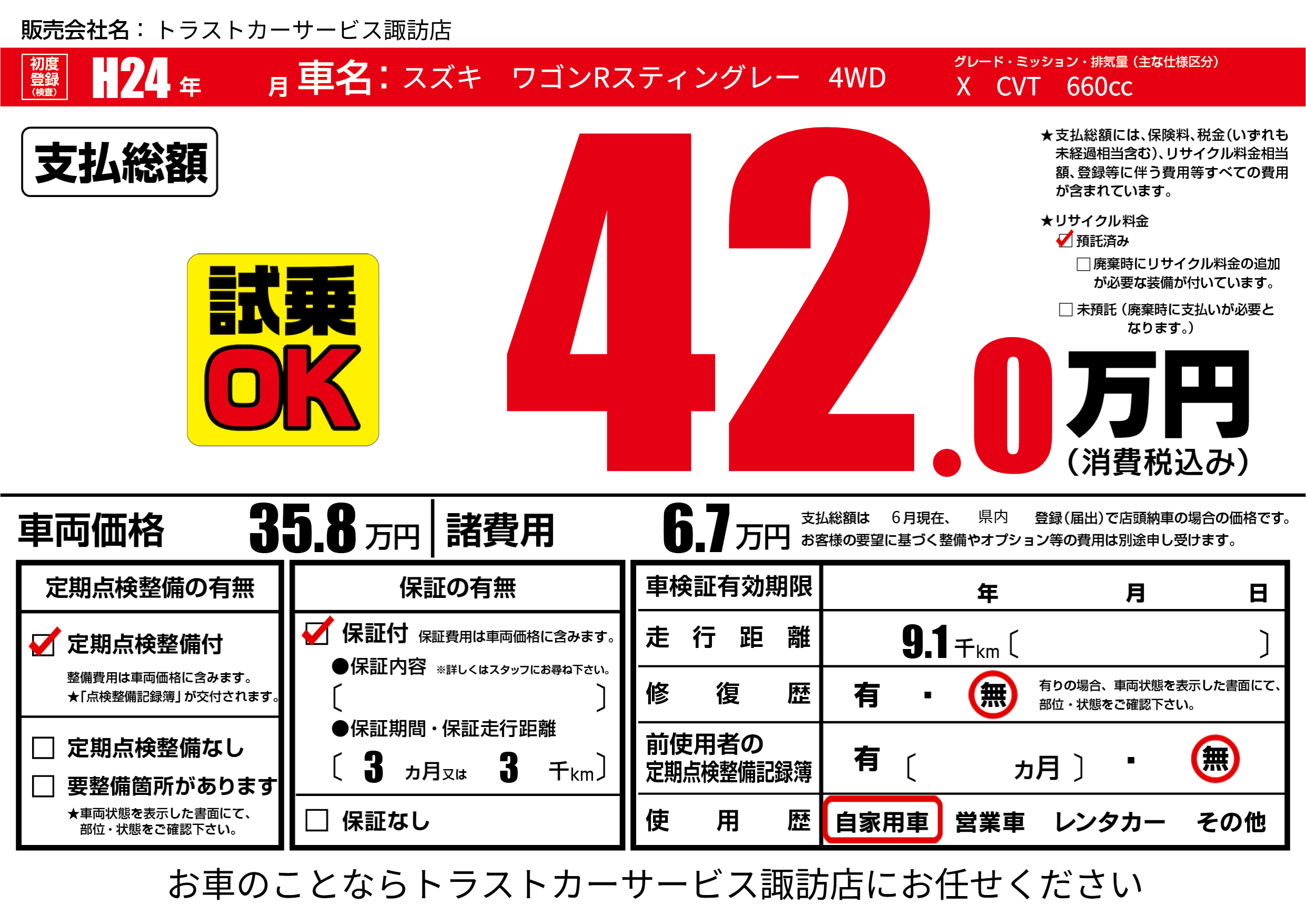 | 車名 | スズキ ワゴンRスティングレー 4WD | グレード ミッション 排気量 |