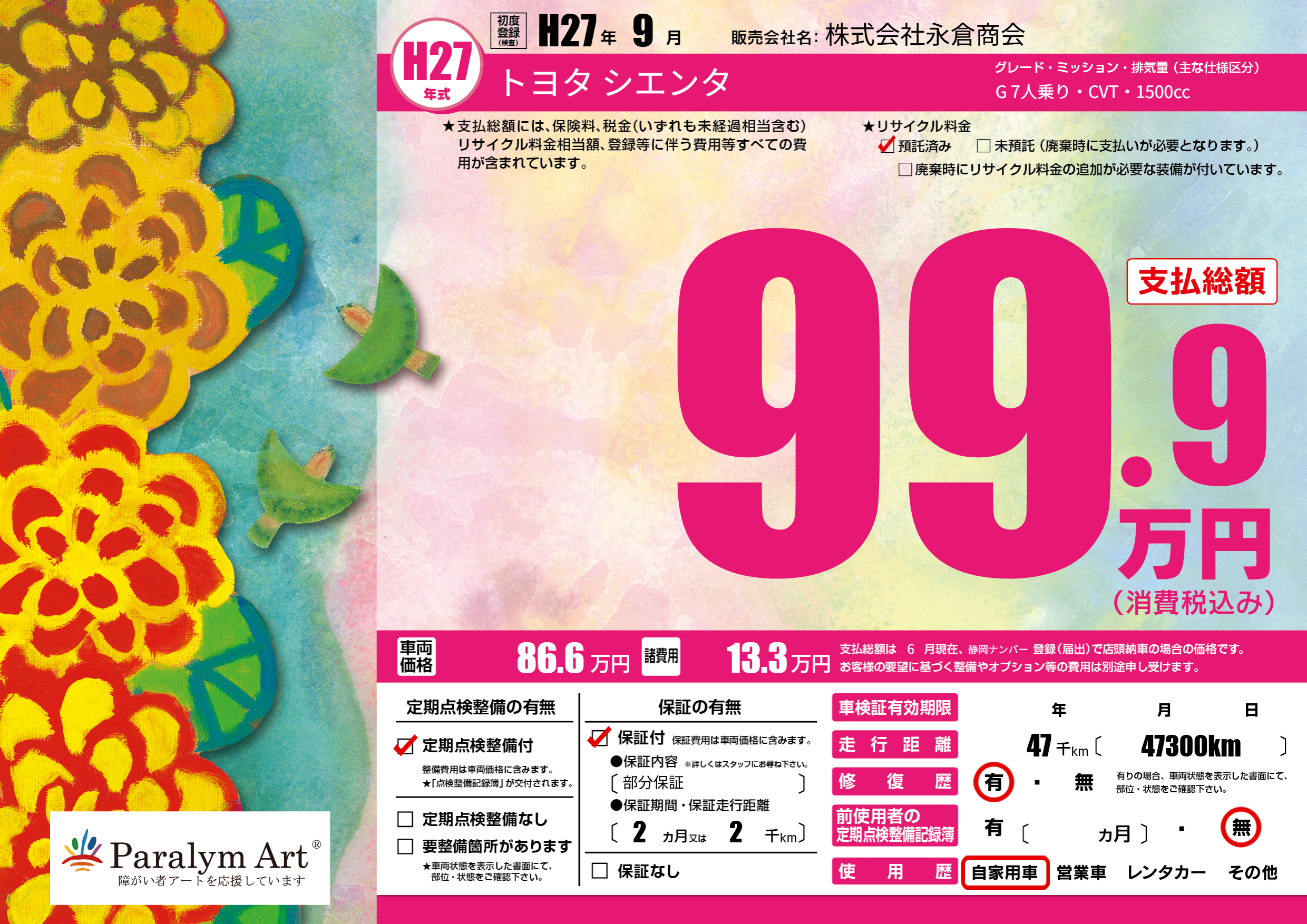 | 車名 | トヨタ シエンタ | グレード ミッション 排気量 |