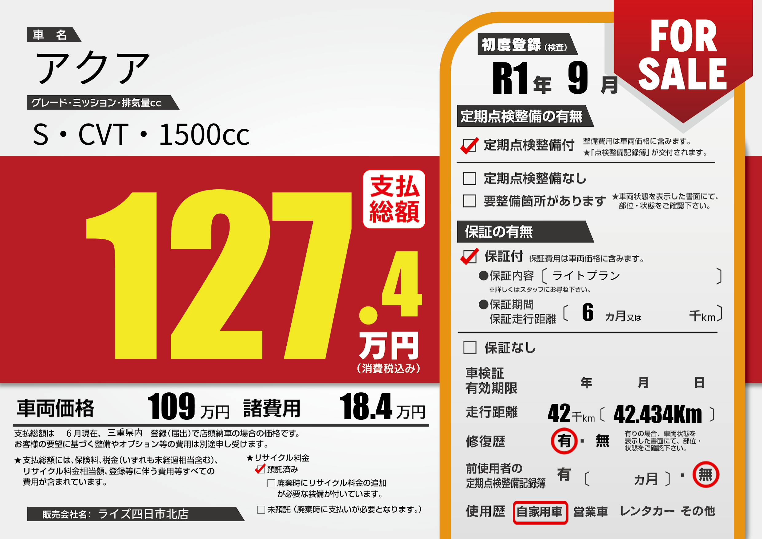 | 走行キロ | 4.2万km | 初年度登録 | R1年9月 |