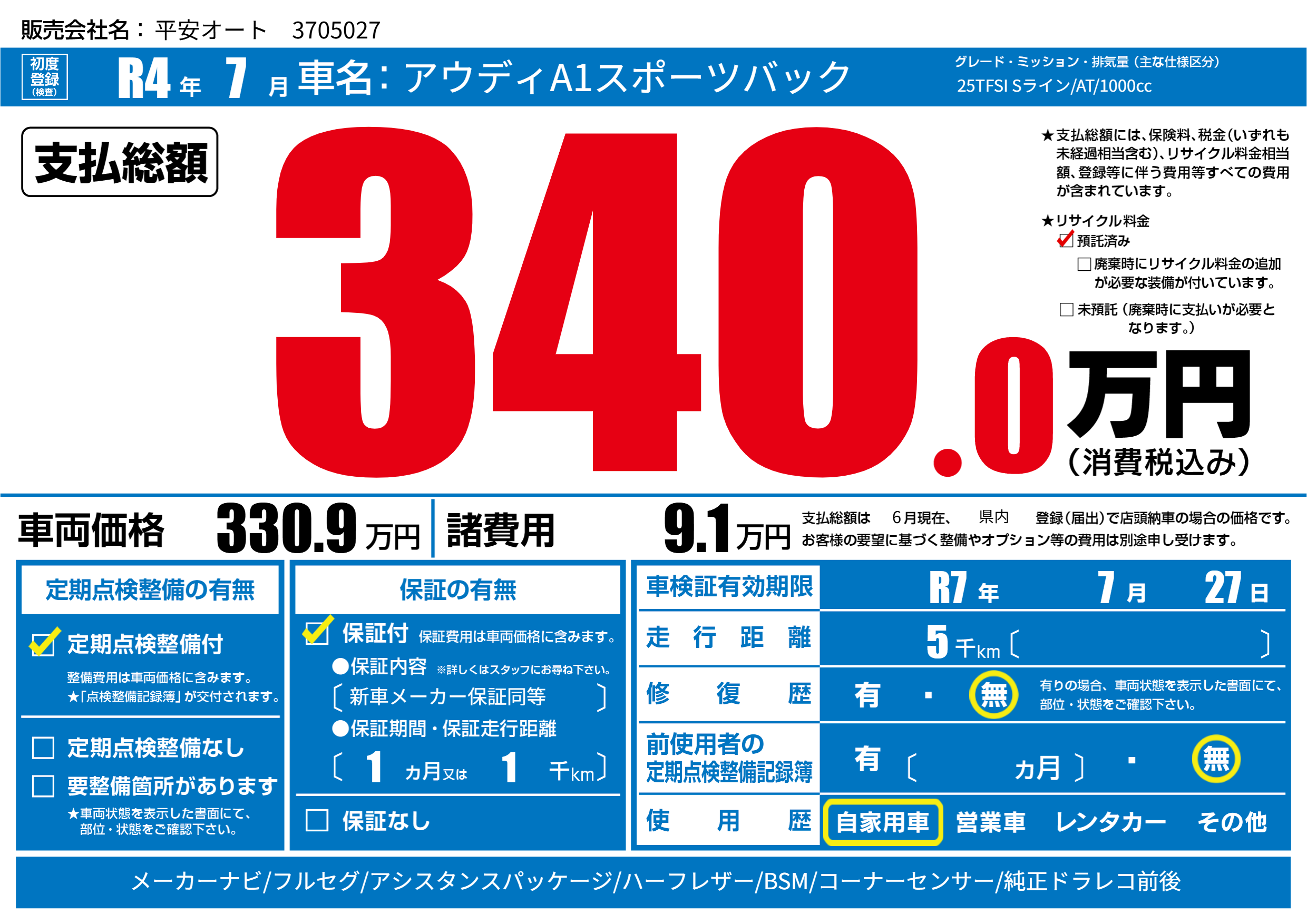 | 車名 | アウディA1スポーツバック | グレード ミッション 排気量 |
