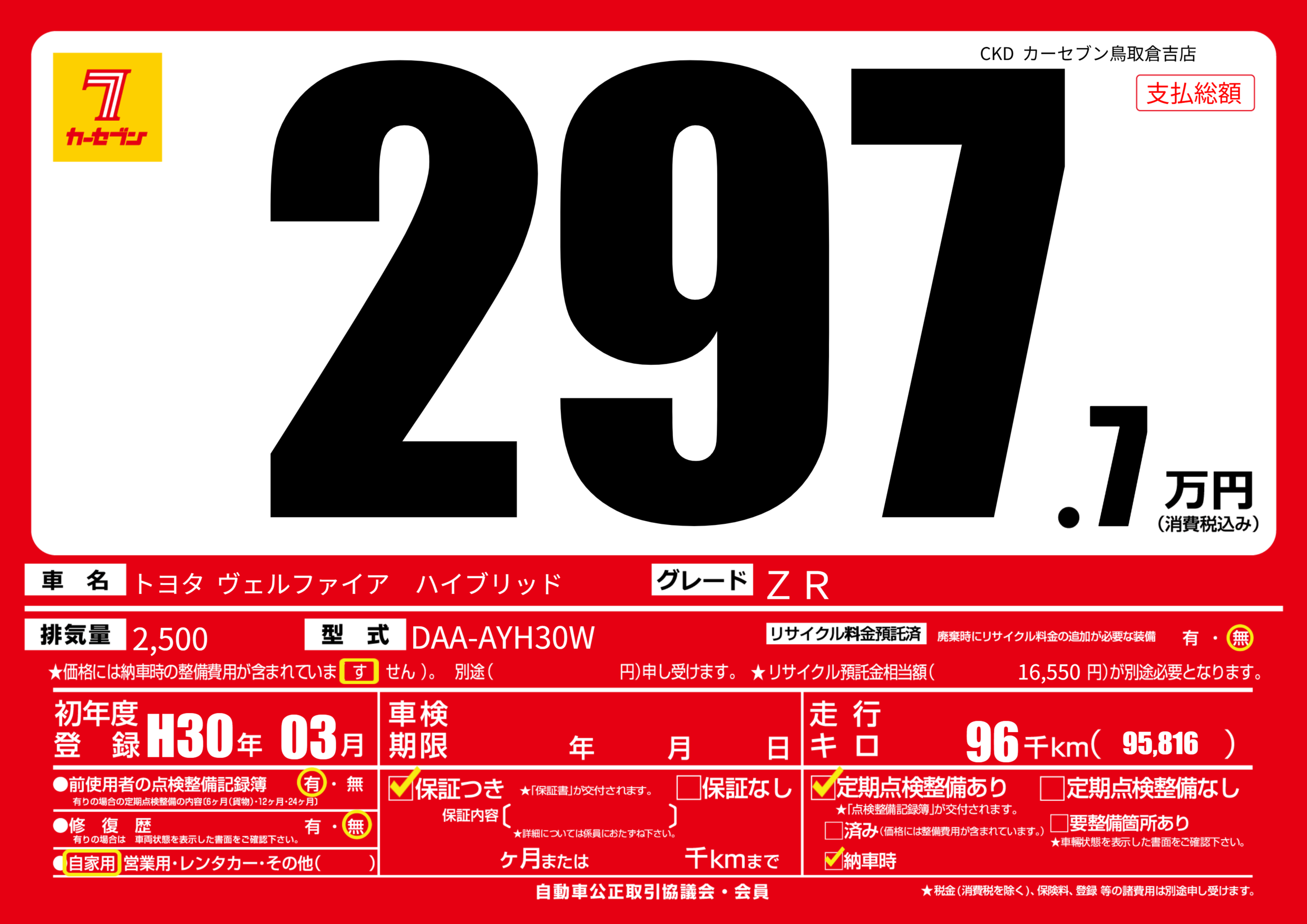 | 車名 | トヨタ ヴェルファイア ハイブリッド | グレード ミッション 排気量 |