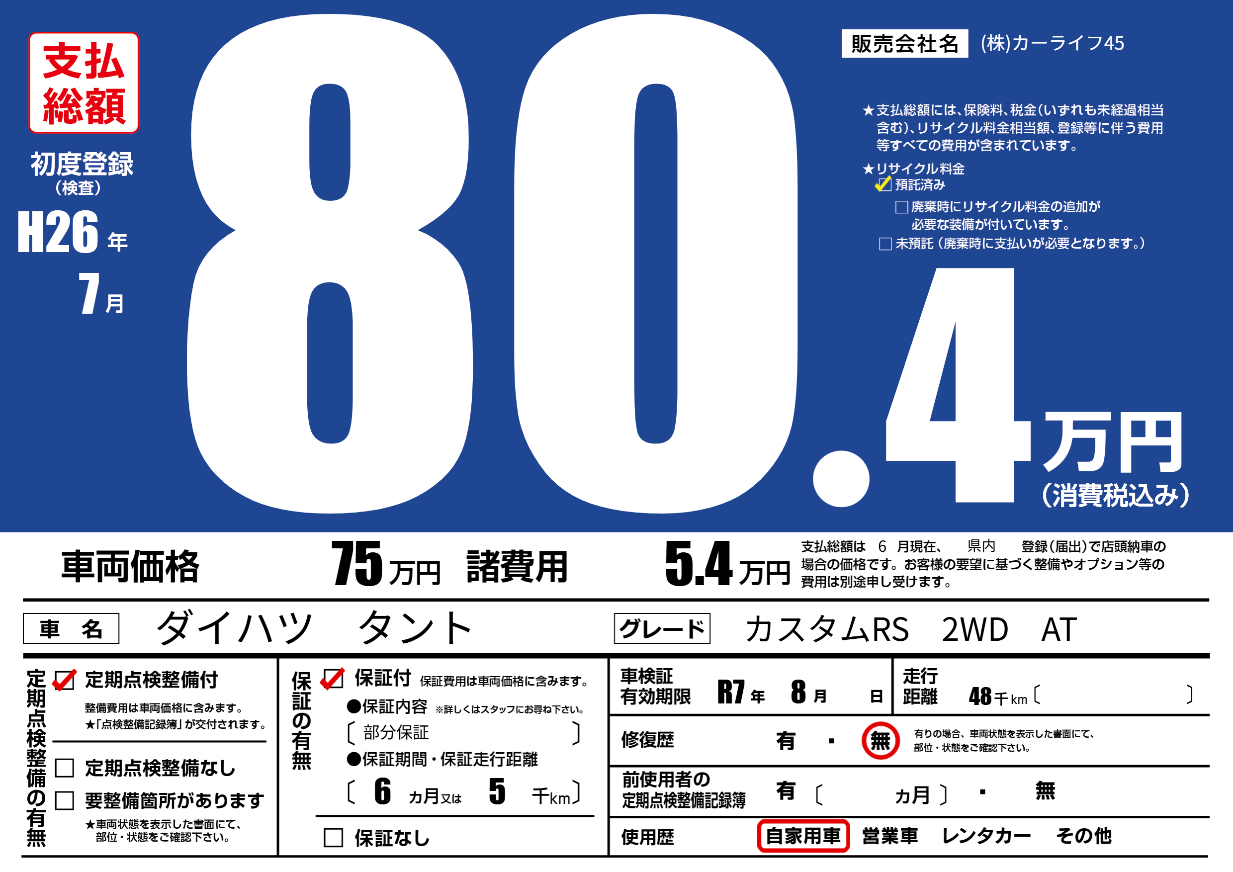 | 走行キロ | 4.8万km | 初年度登録 | H26年7月 |