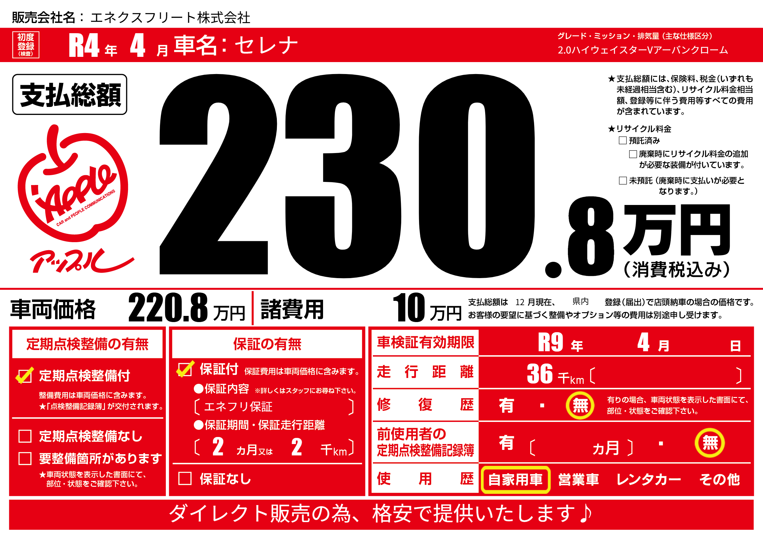 保証付き 保証内容(エネフリ保証) 2ヶ月または(2)千kmまで |