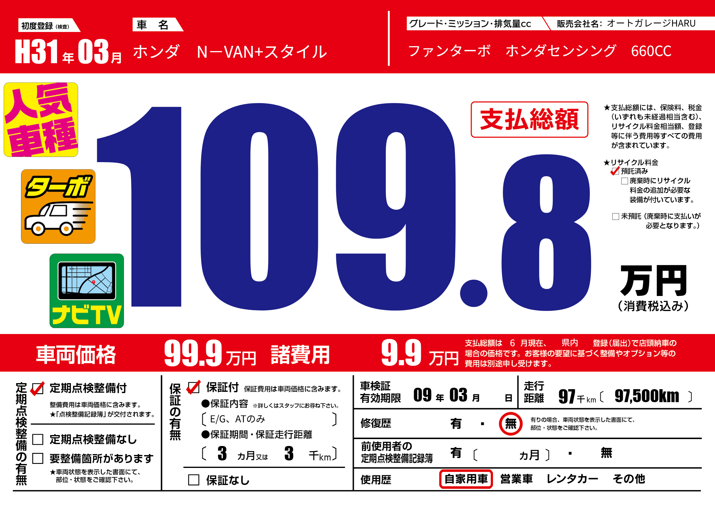 | 車名 | ホンダ N-VAN+スタイル | グレード ミッション 排気量 |