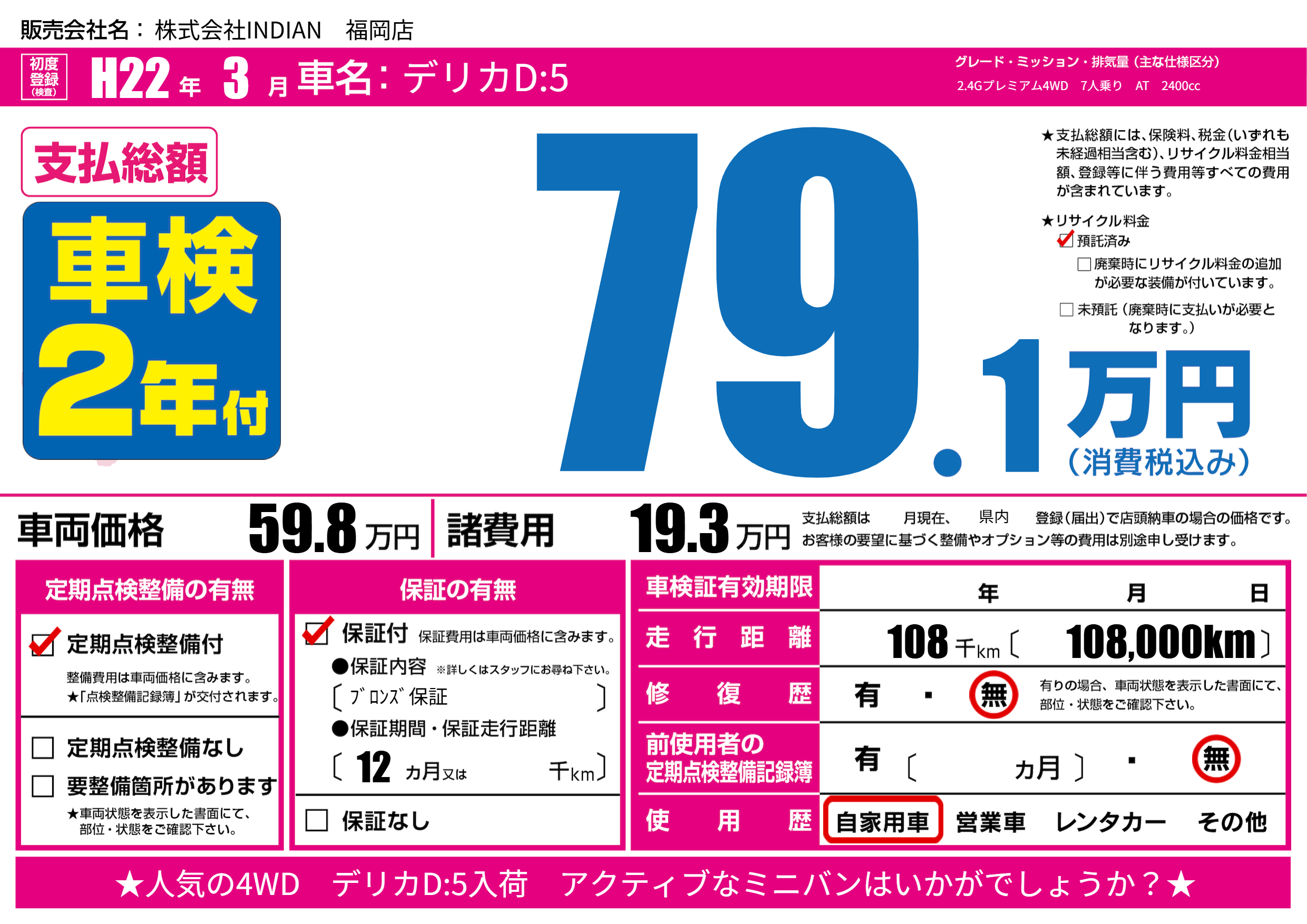 | 車名 | デリカD:5 | グレード ミッション 排気量 |