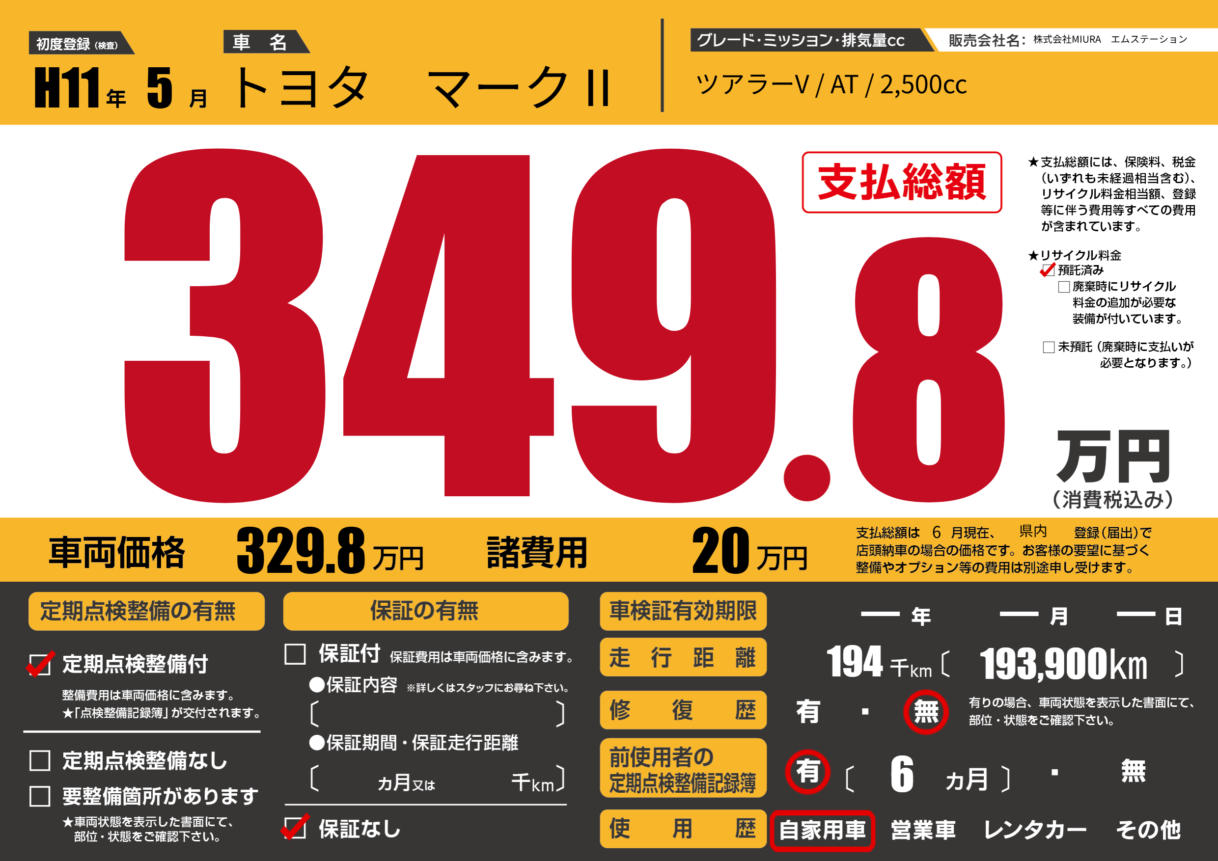 | 車名 | トヨタ マークⅡ | グレード ミッション 排気量 |