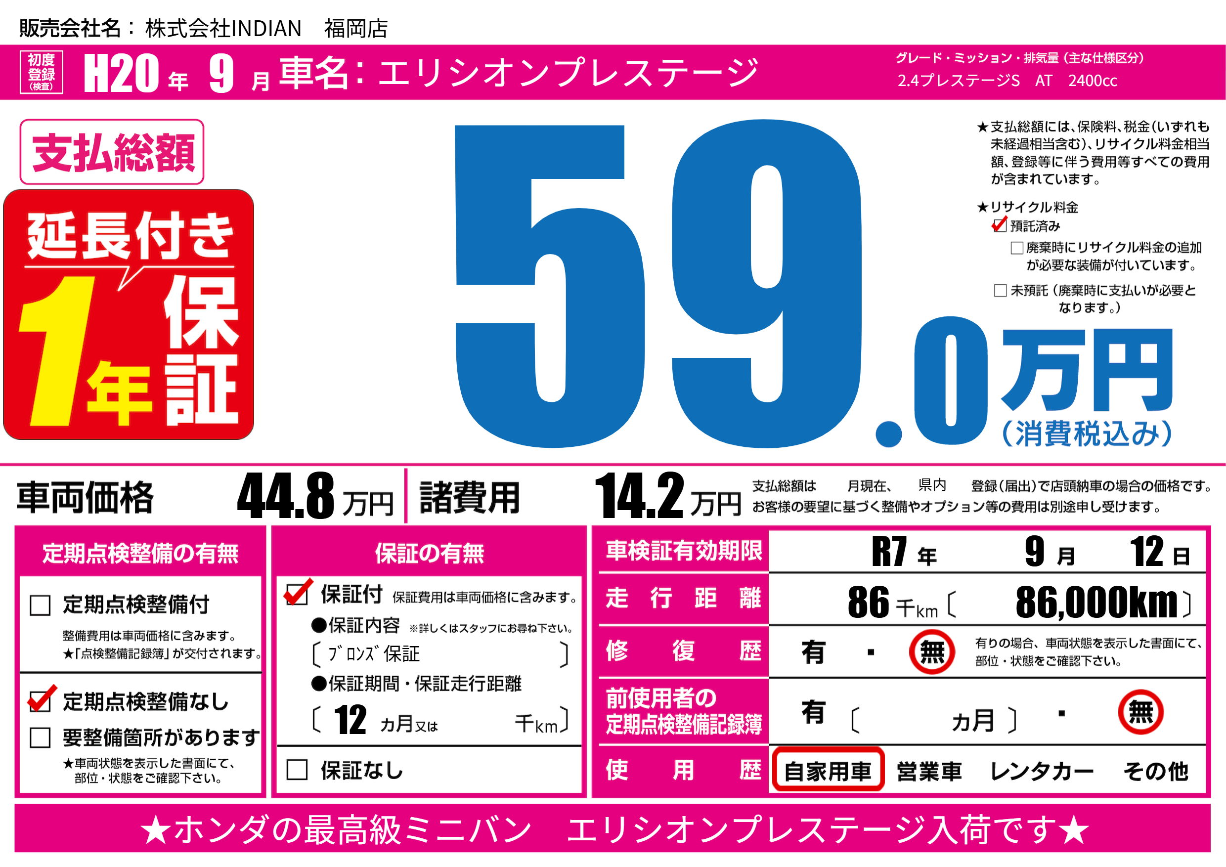 | 車名 | エリシオンプレステージ | グレード ミッション 排気量 |
