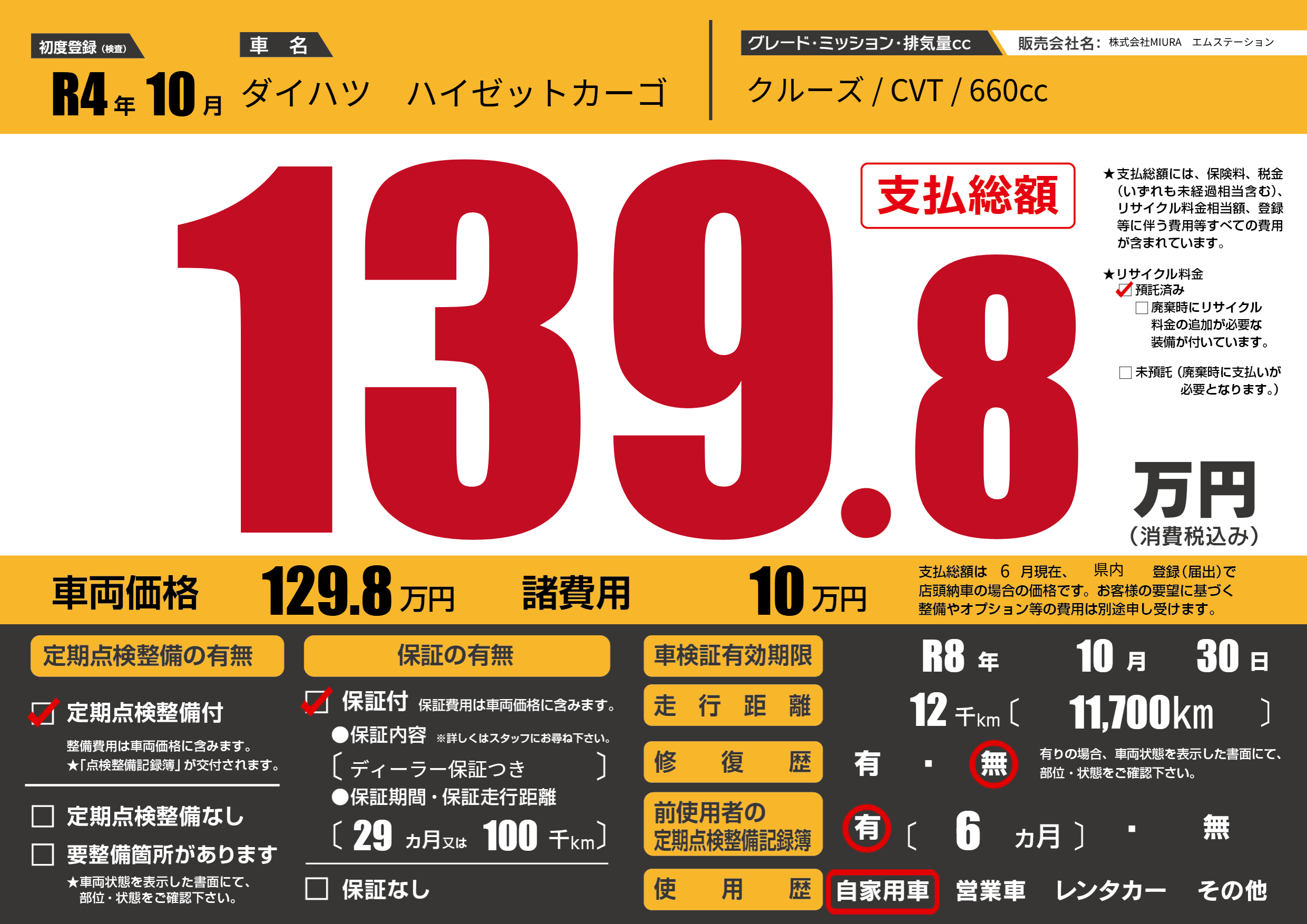 | 走行キロ | 1.2万km | 初年度登録 | R4年10月 |