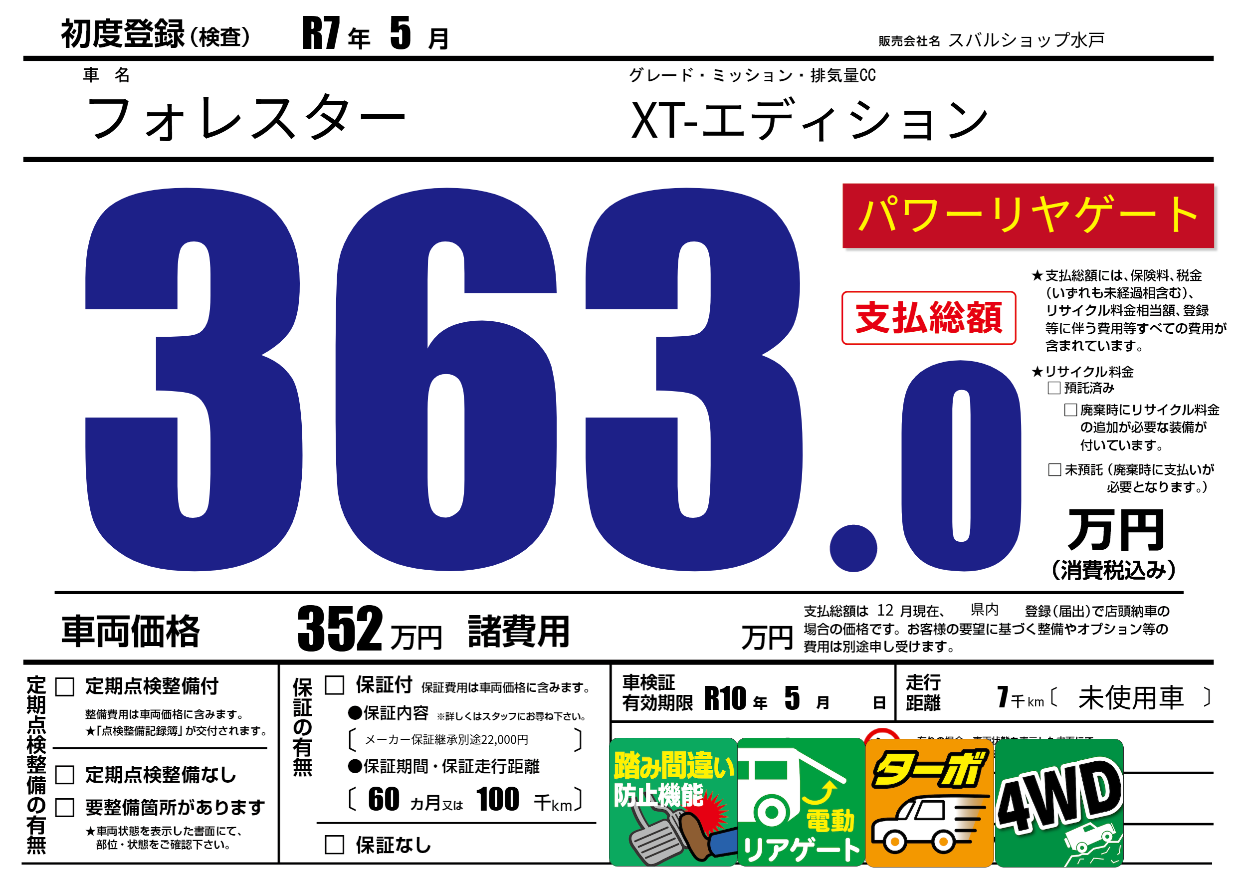 | 車名 | フォレスター | グレード ミッション 排気量 |