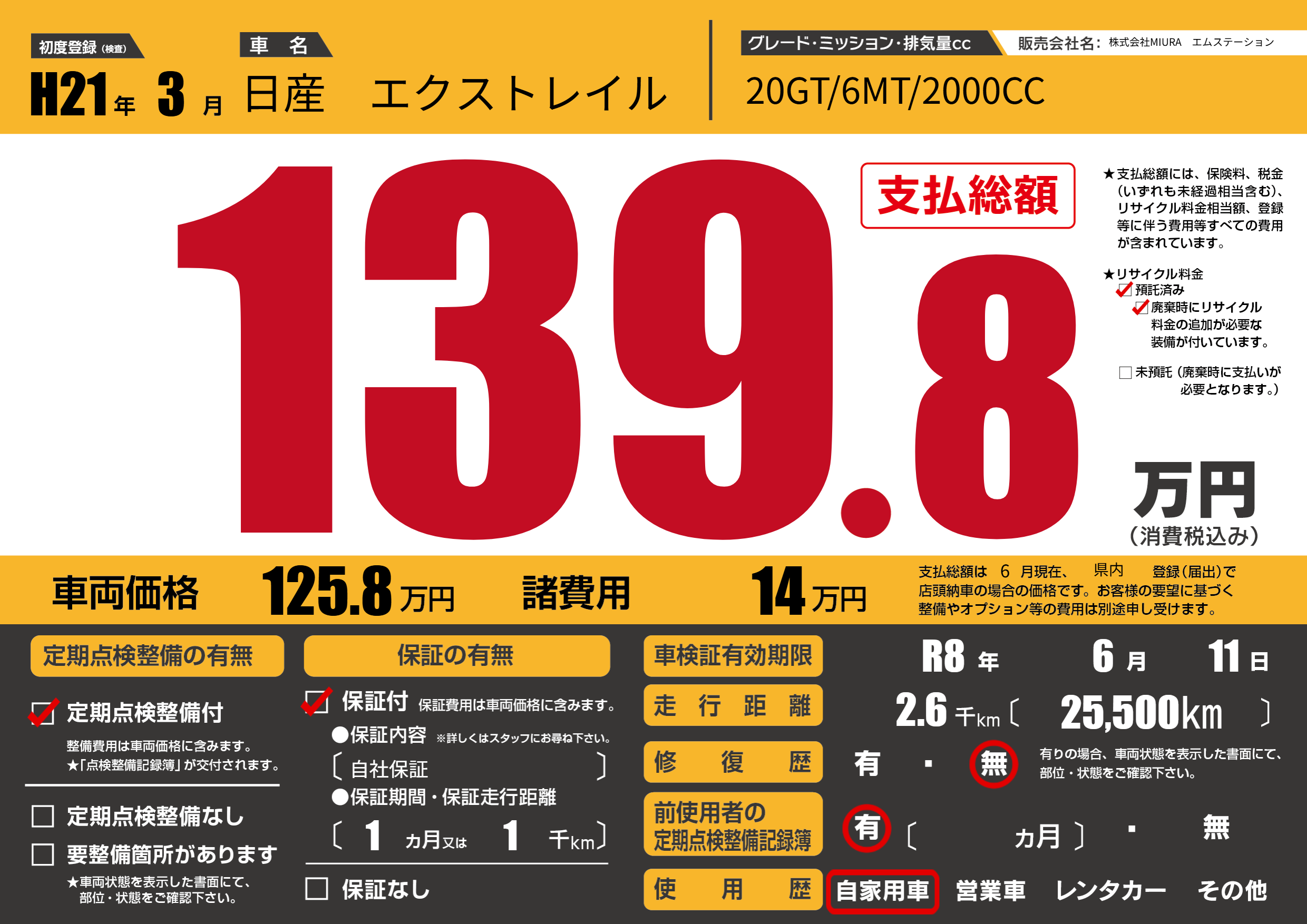 | 車検制限 | R8年 6月 11日 | ||
