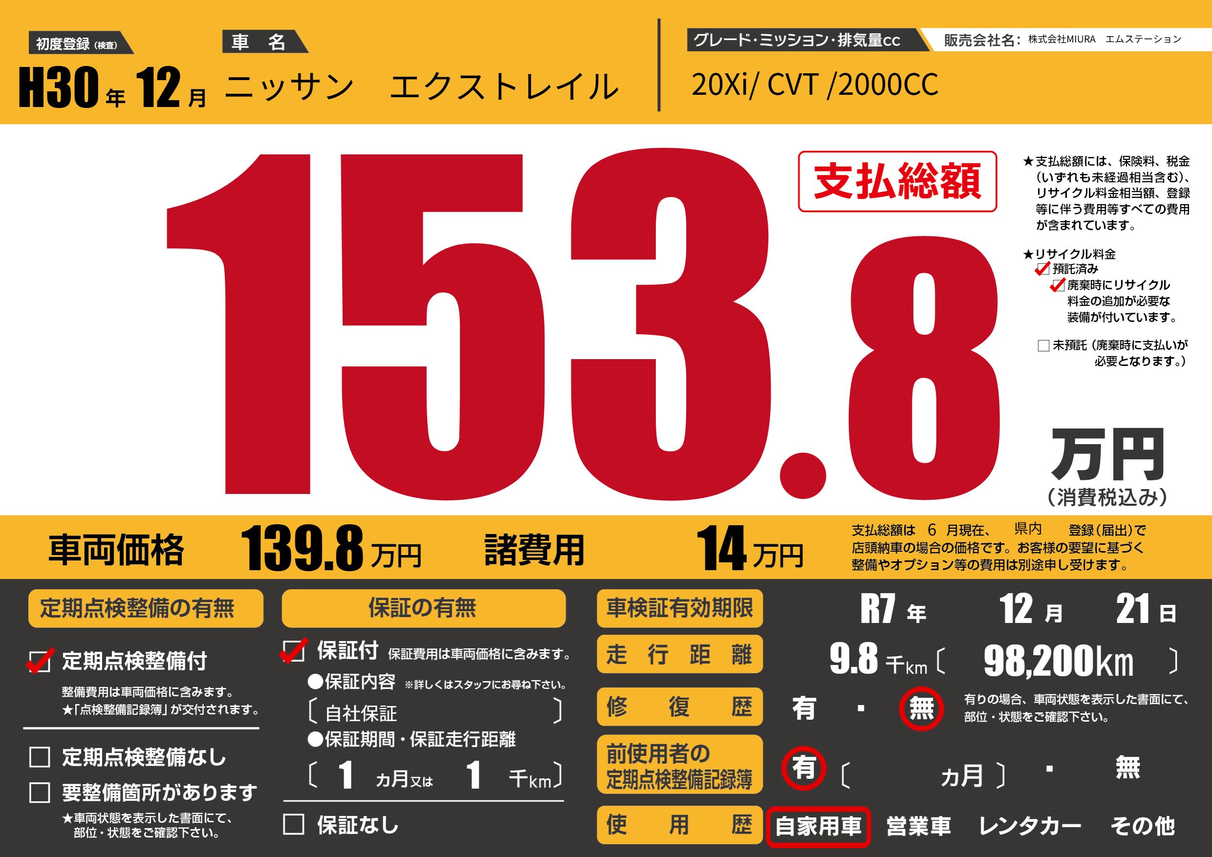 | 車名 | ニッサン エクストレイル | グレード ミッション 排気量 |