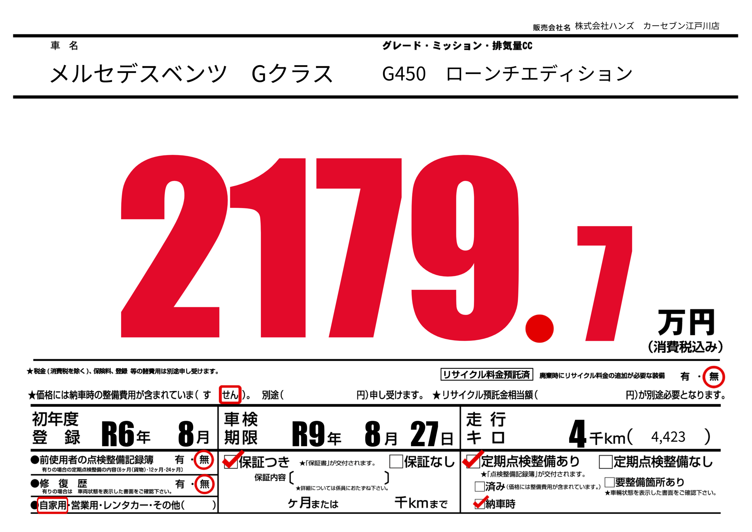 | 車名 | メルセデスベンツ Gクラス | グレード ミッション 排気量 |